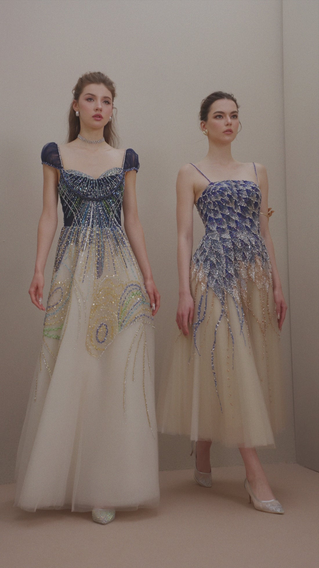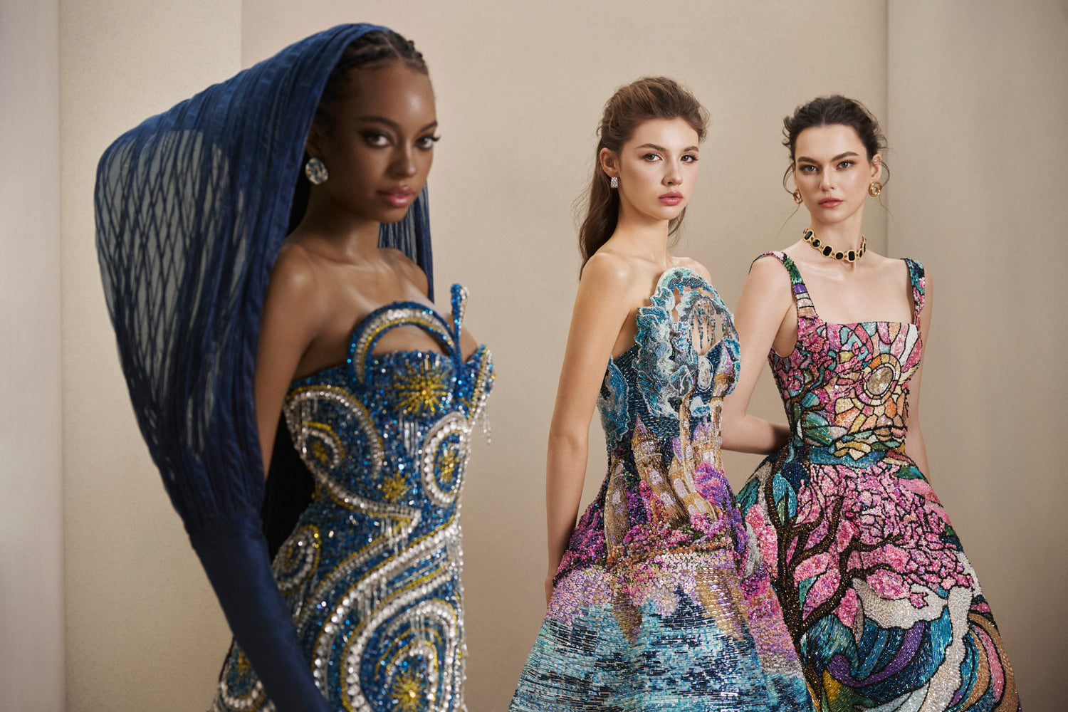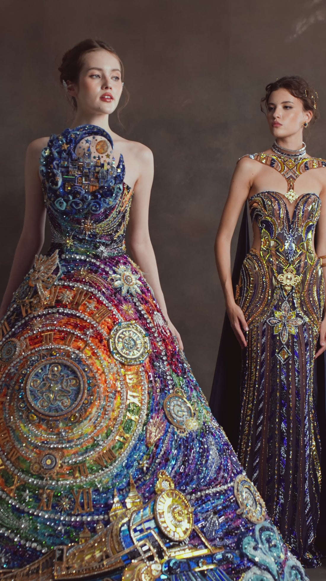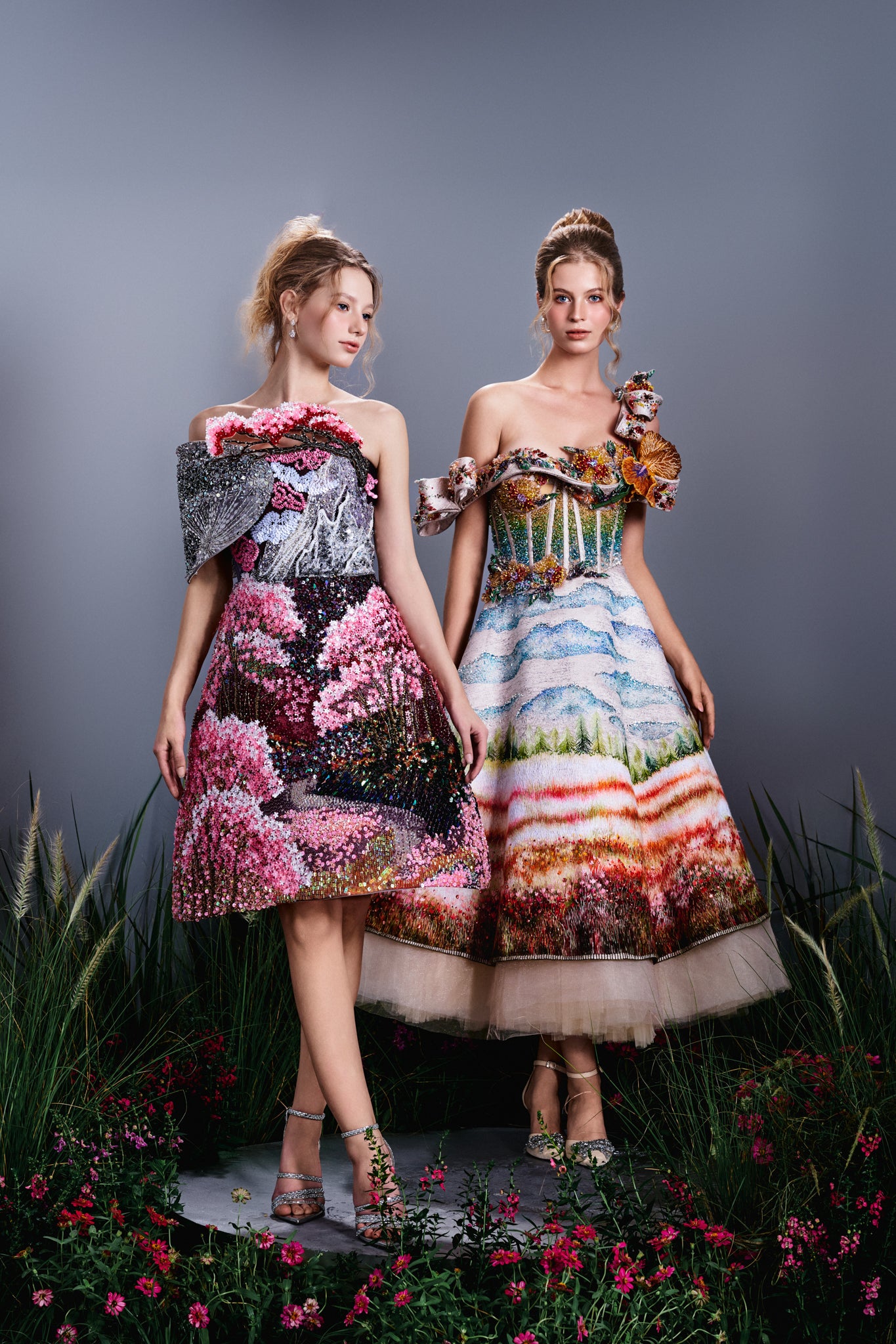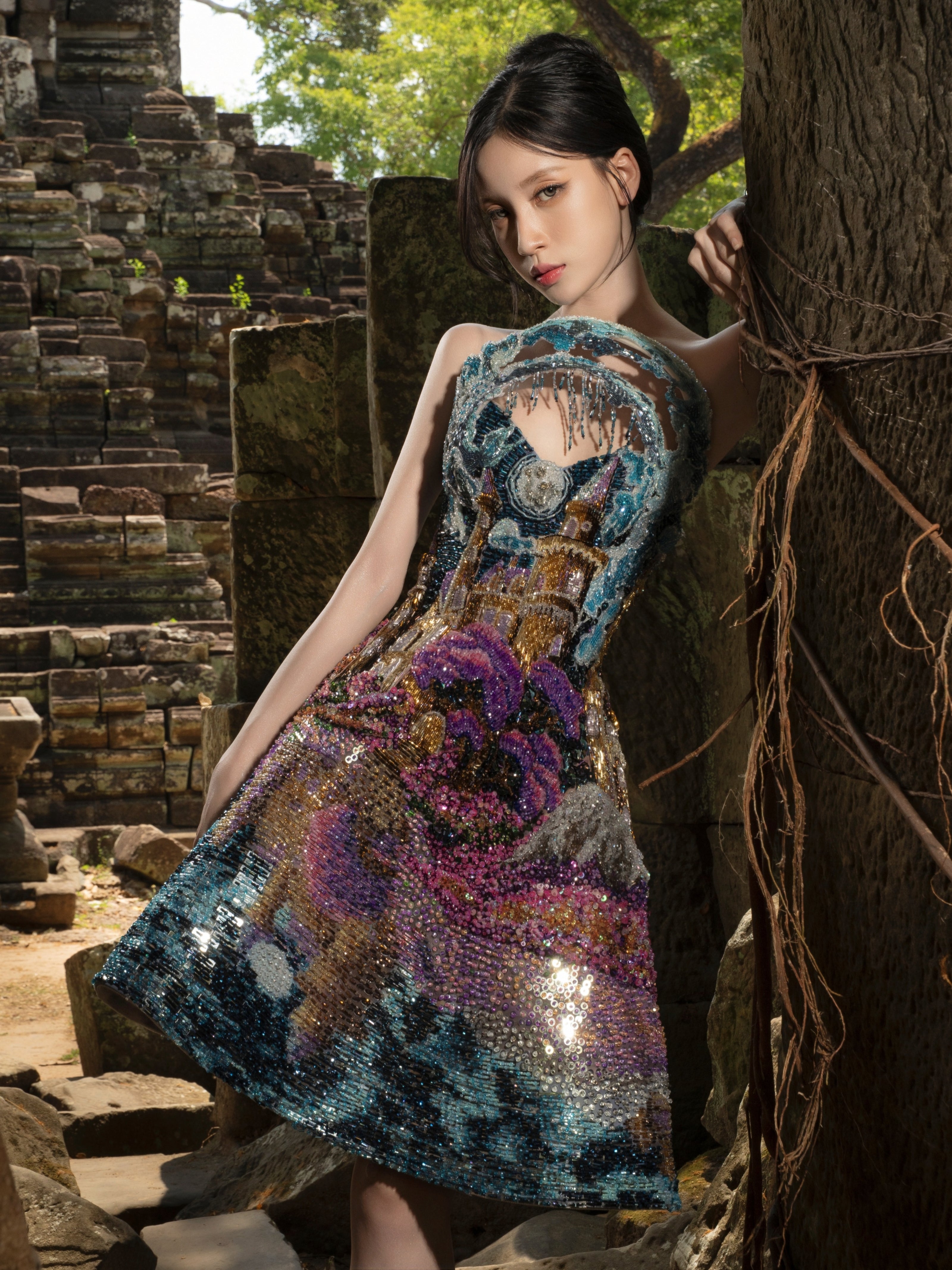 From pastoral landscapes to blossoming flora, every piece captures the unseen beauty that surrounds us — translated through thousands of hand-sewn crystals, sequins, and intricate embroidery. Two signature designs pay tribute to Khmer heritage, reinterpreting traditional motifs with a contemporary couture language.