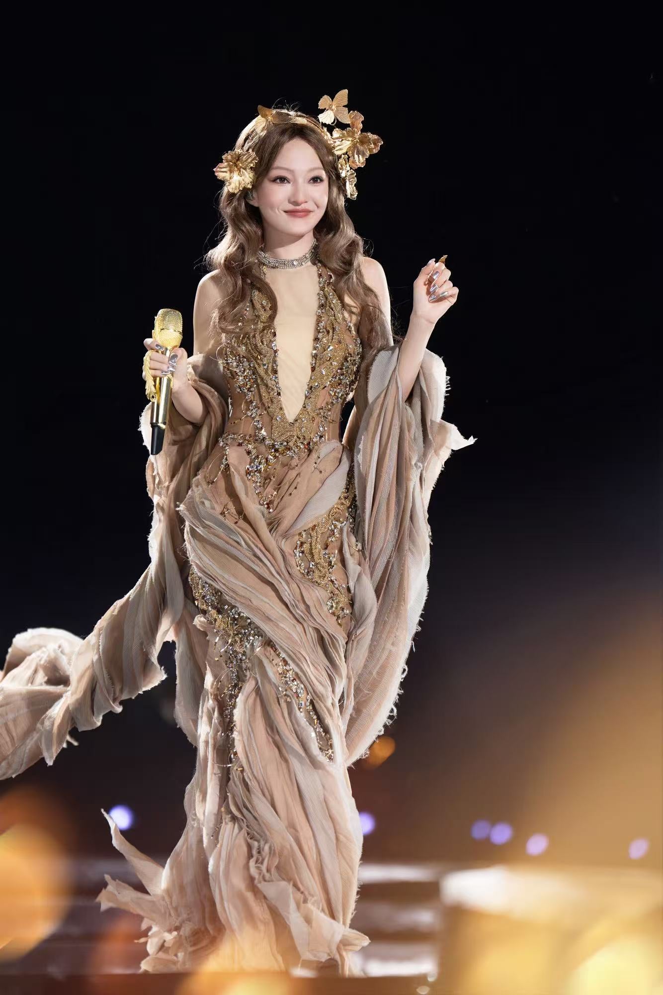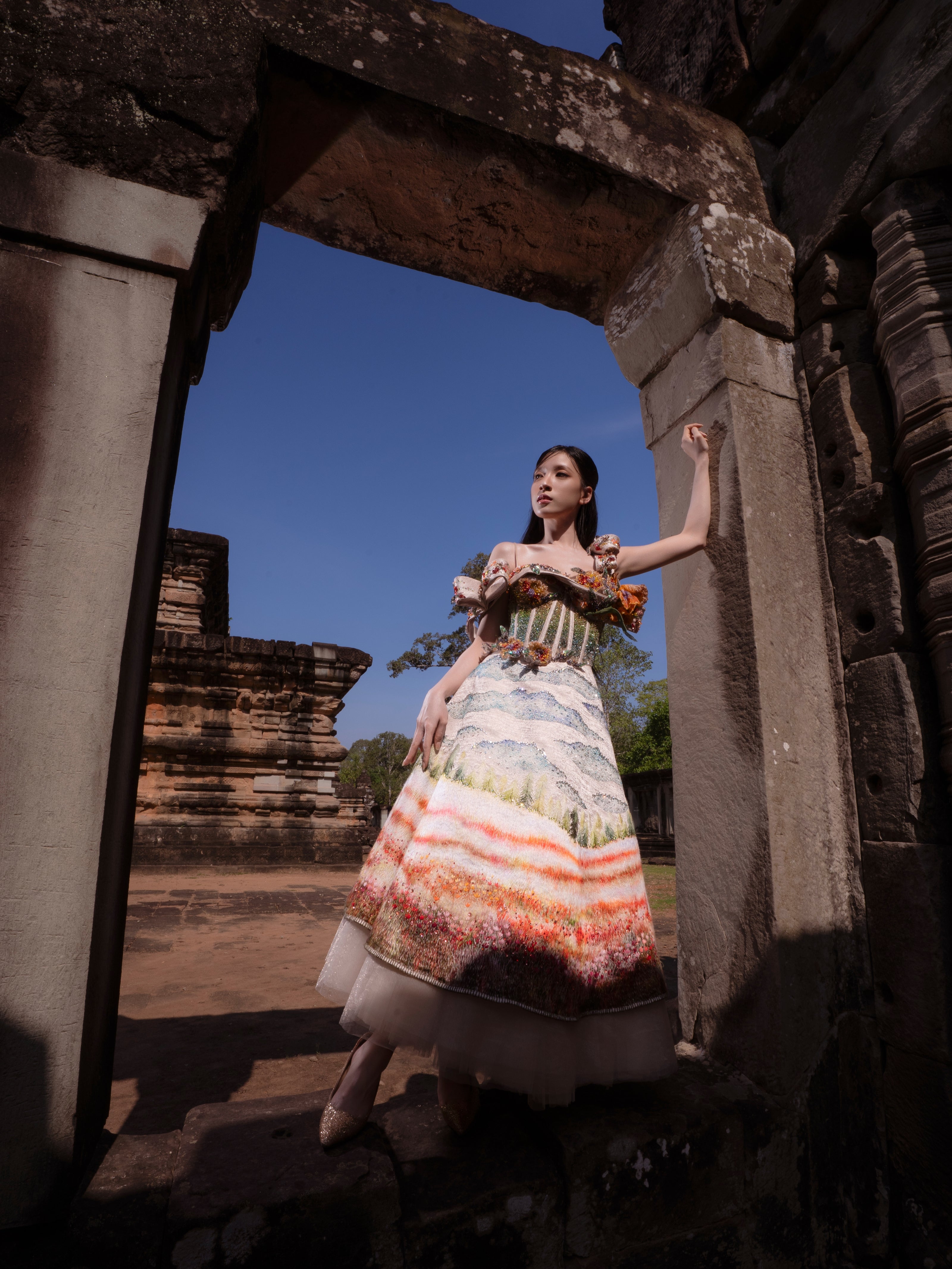 SK embraces the timeless beauty of Angkor Wat in a bespoke Almée Couture creation. The gown, hand-embroidered with intricate details, reflects the harmony between Cambodian heritage and modern couture artistry.