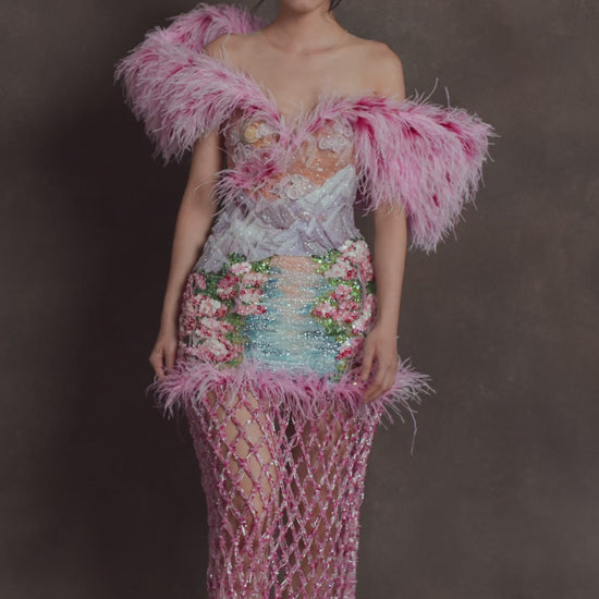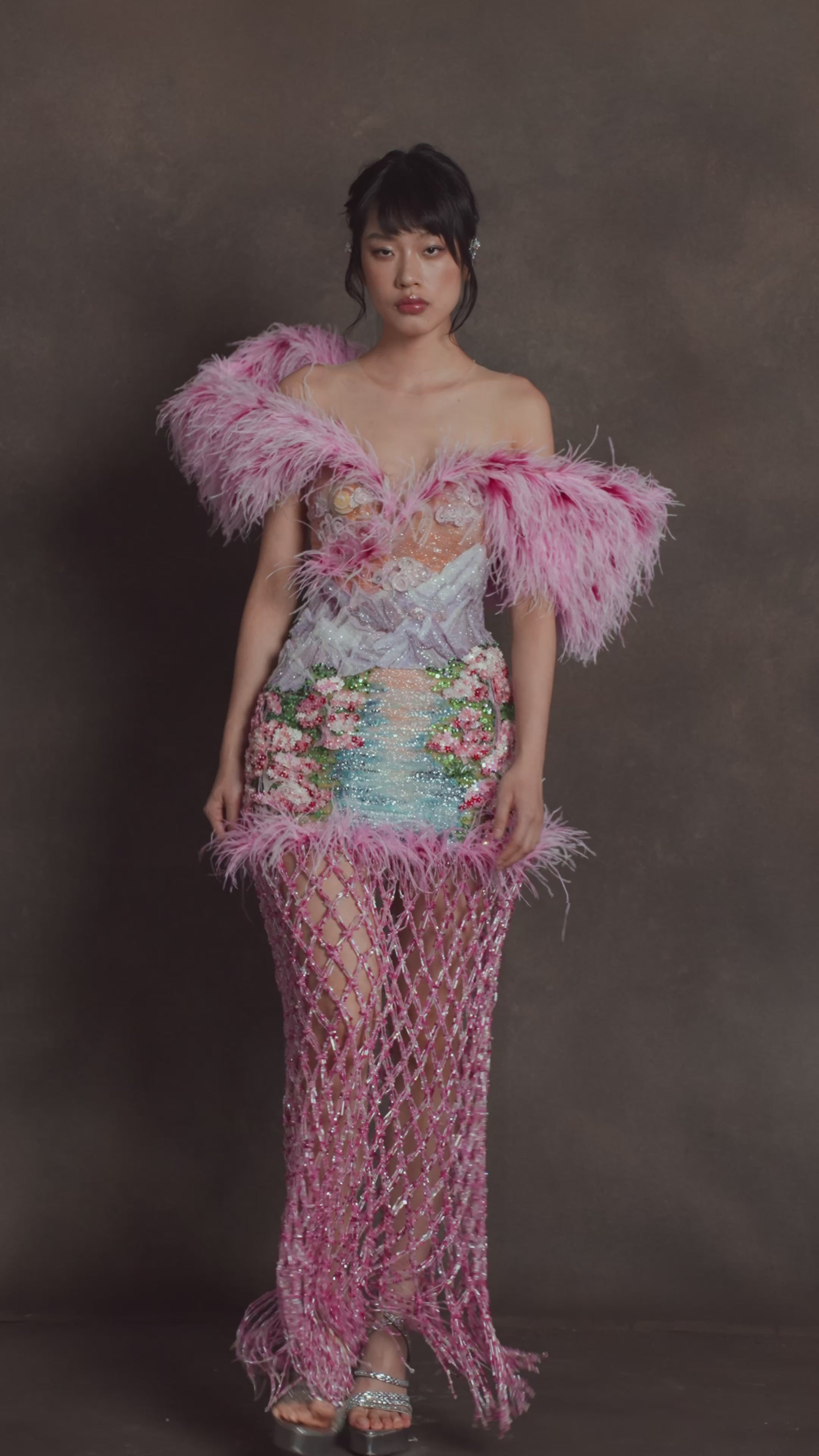 Ignite the runway with Blossom Flame, a striking pink gown crowned with a dramatic feathered neckline.