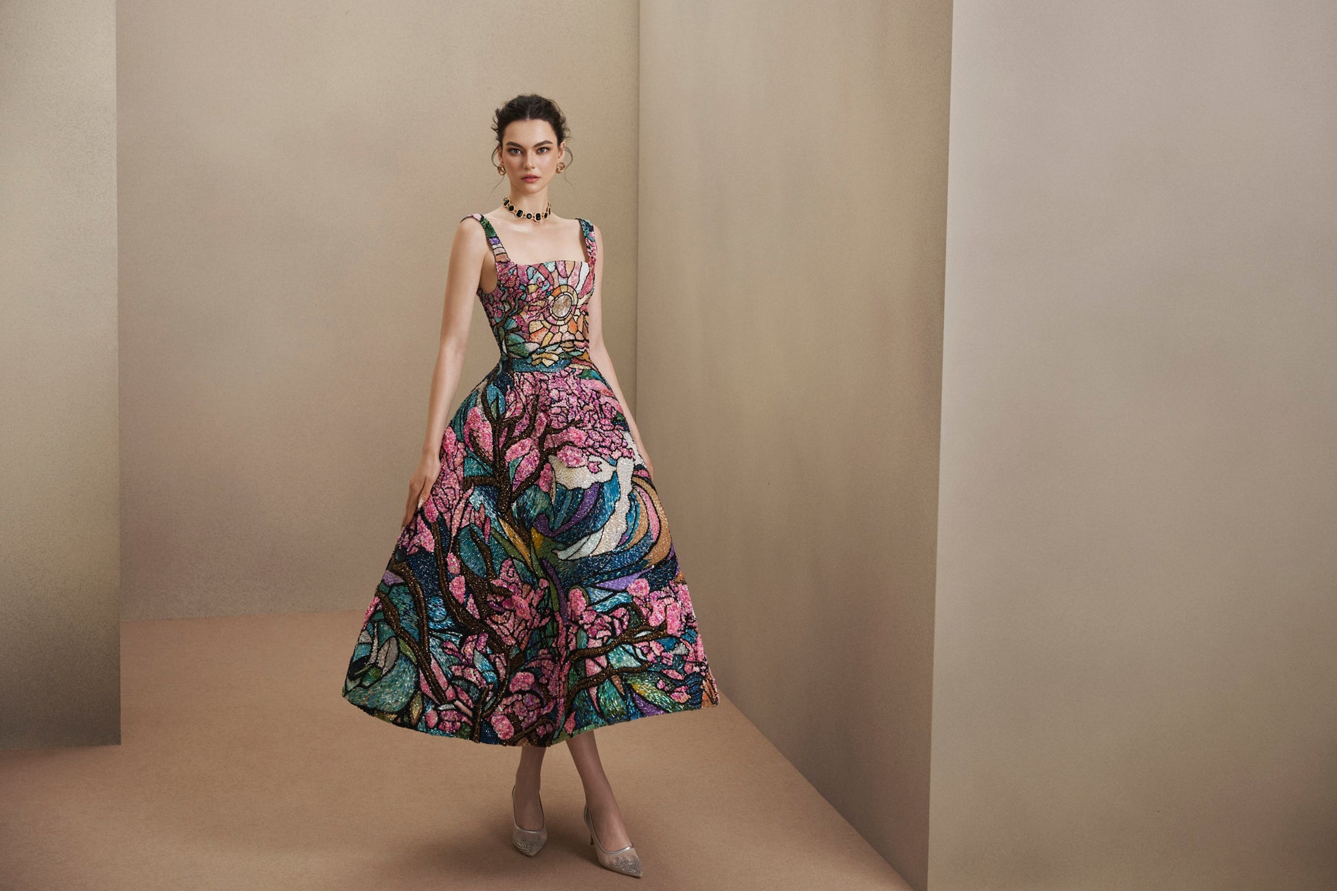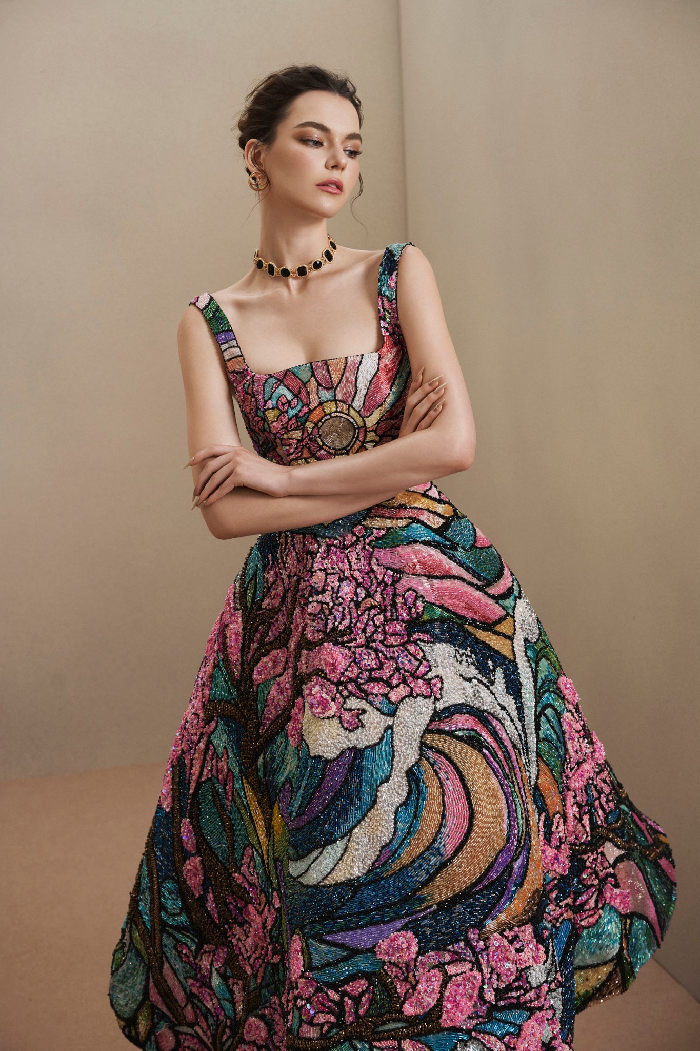 A living artwork — Blossom Mosaic mirrors the beauty of stained glass, with hand-embroidered florals and abstract patterns blooming across the dress. Each bead and sequin is placed like a brushstroke, celebrating nature in a radiant tapestry of colors.