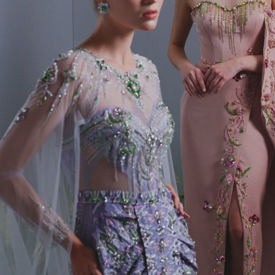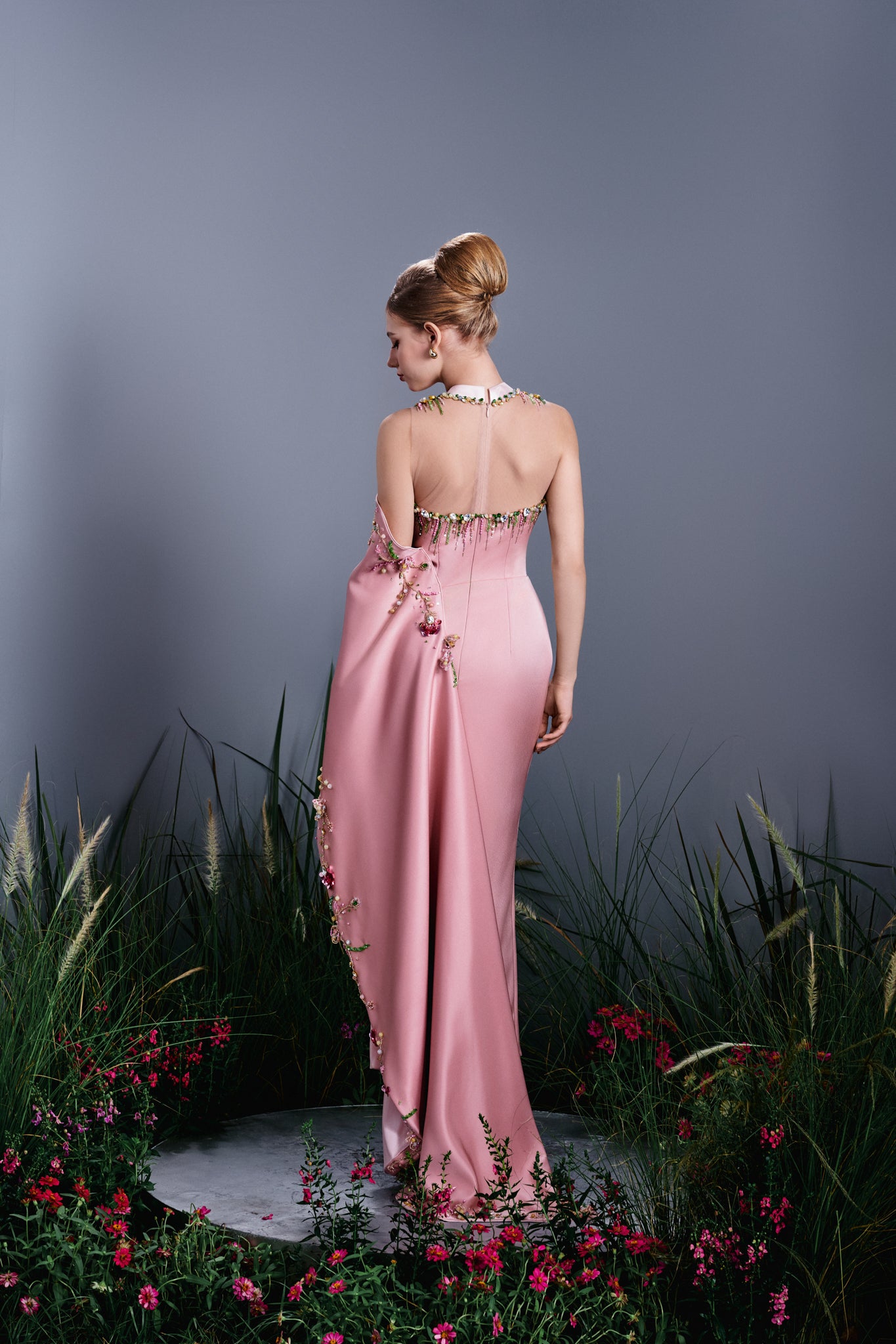 A refined homage to timeless heritage, this blush-pink gown is adorned with intricate floral beadwork cascading along the silhouette. The structured bodice features delicate embellishments framing the neckline, while an asymmetric drape extends gracefully, symbolizing elegance and cultural pride. Every hand-sewn detail reflects the artistry of preservation and modern grace.