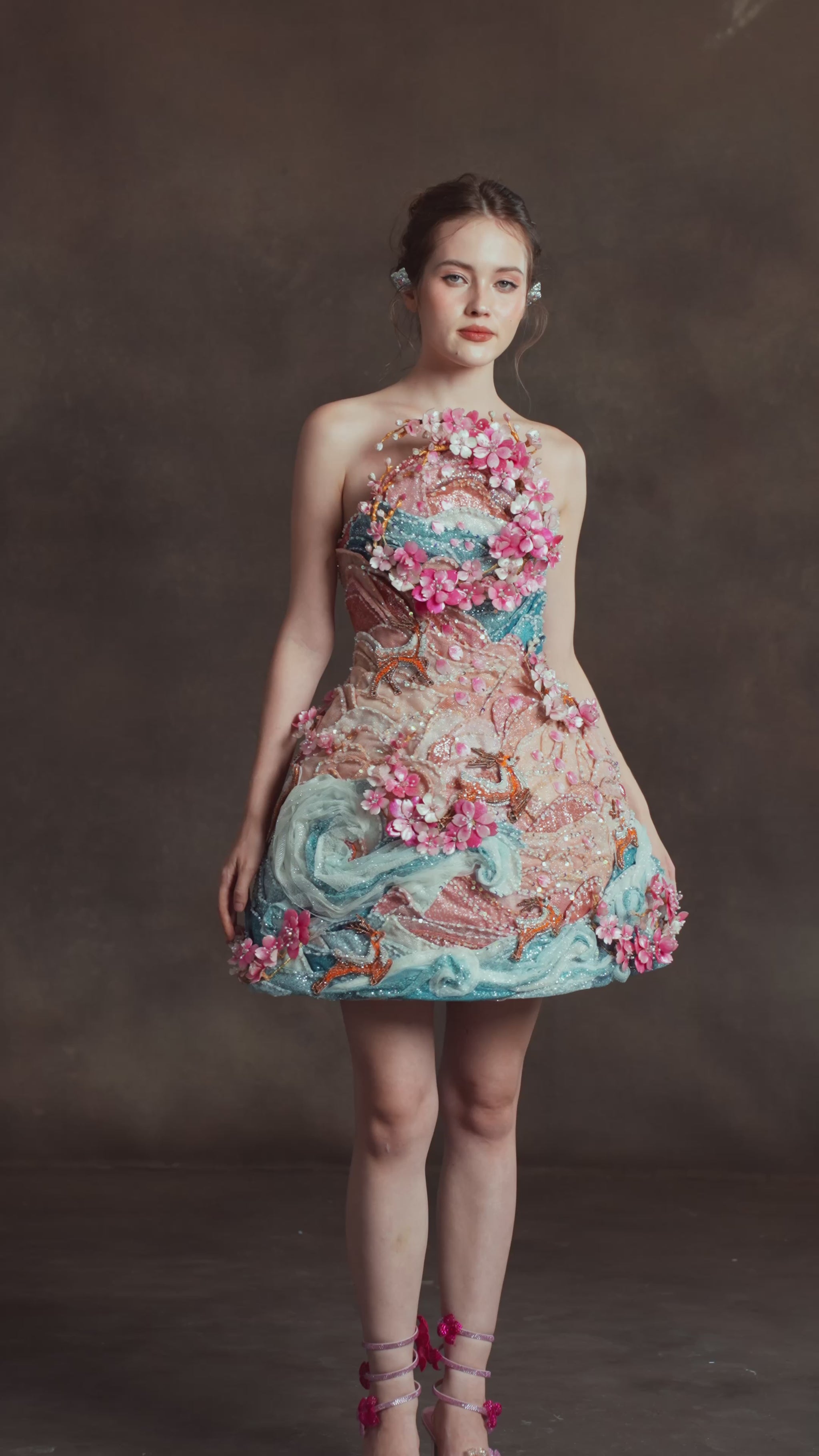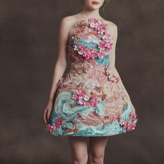 The mini dress features layers of hand-embroidered blossoms that seem to float on rippling beadwork, evoking waves glistening under dawn light. The soft gradient of blush and seafoam hues mirrors nature’s quiet awakening, while the flared silhouette adds movement and grace.