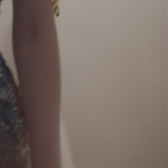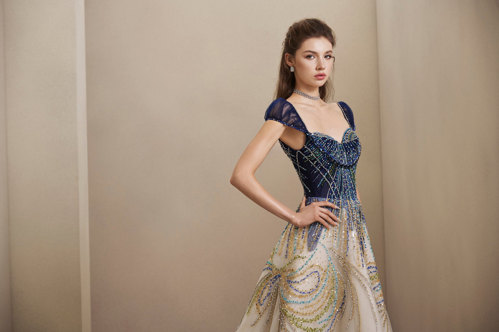 A night-sky fantasy — Celestial Dream Gown glows with radiant beadwork that fans out like shooting stars across a midnight silk bodice and airy tulle skirt. A blend of elegance and cosmic allure, it captures the beauty of light dancing in the heavens.