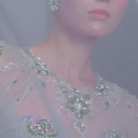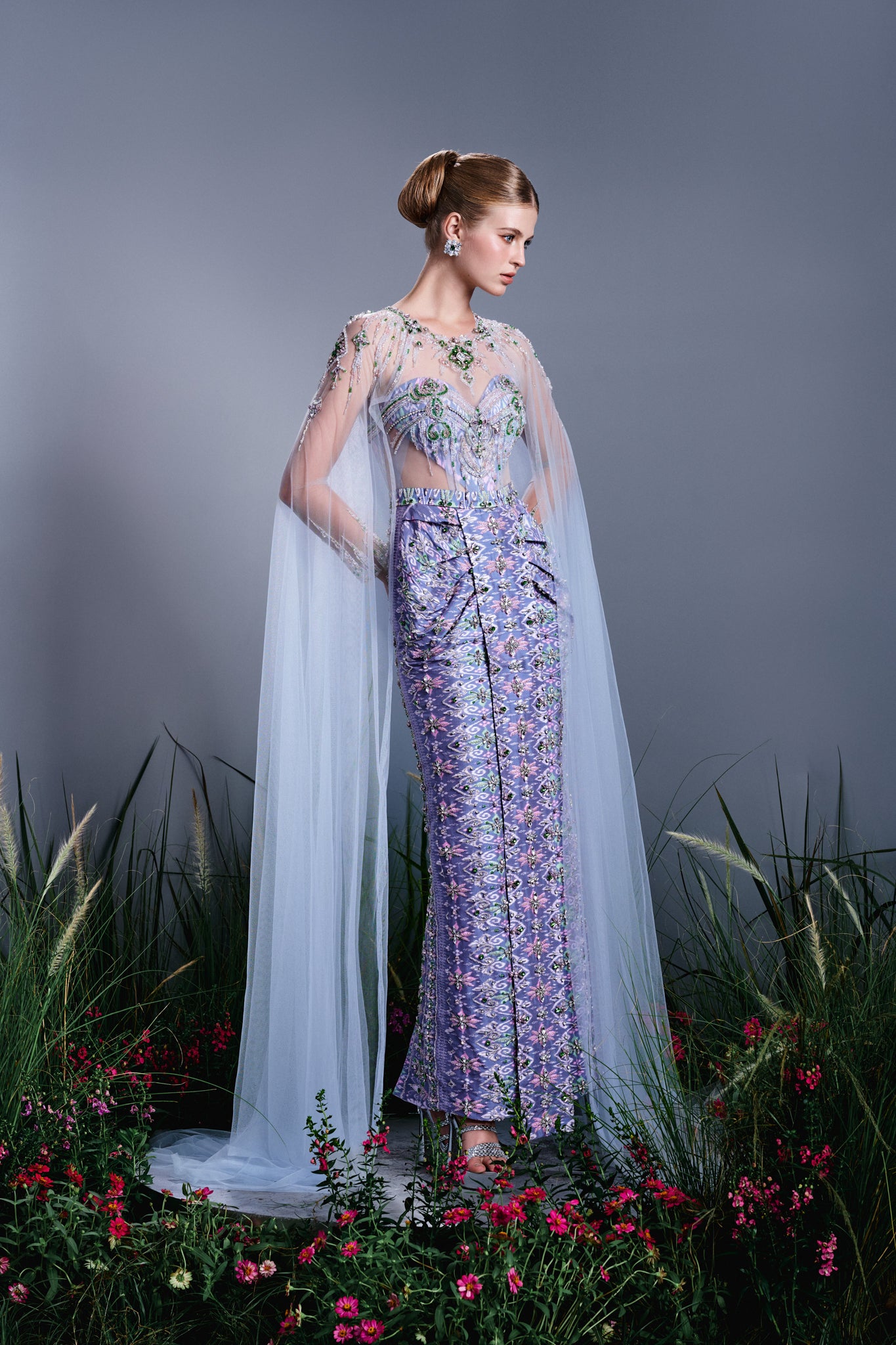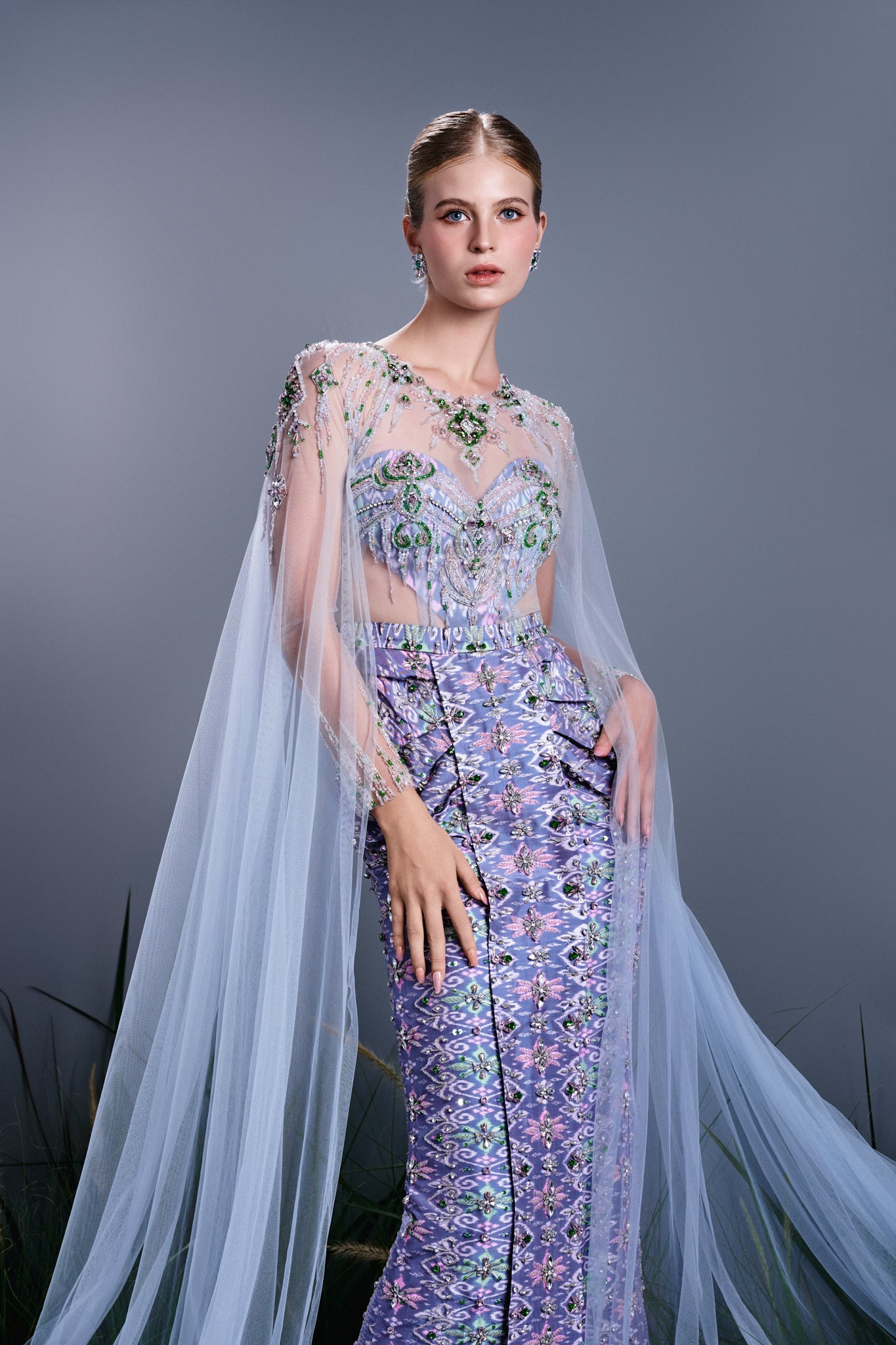 A celestial celebration of Khmer ikat heritage, this gown fuses shimmering silk brocade with ethereal tulle capes flowing like starlight. Intricate hand-embroidery with crystals and gemstones illuminates the bodice, evoking cosmic balance and timeless elegance.