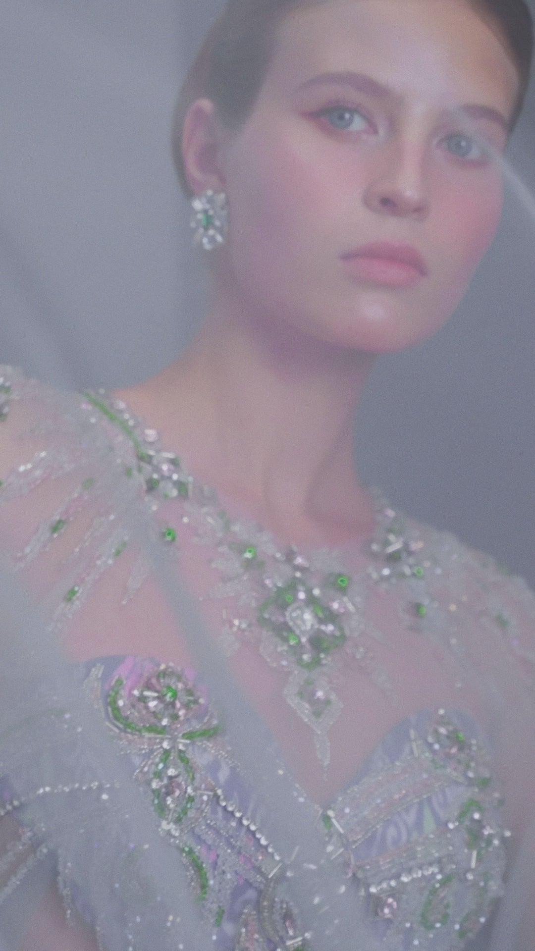 Materials: silk brocade, silk tulle, crystals, gemstones, sequins
