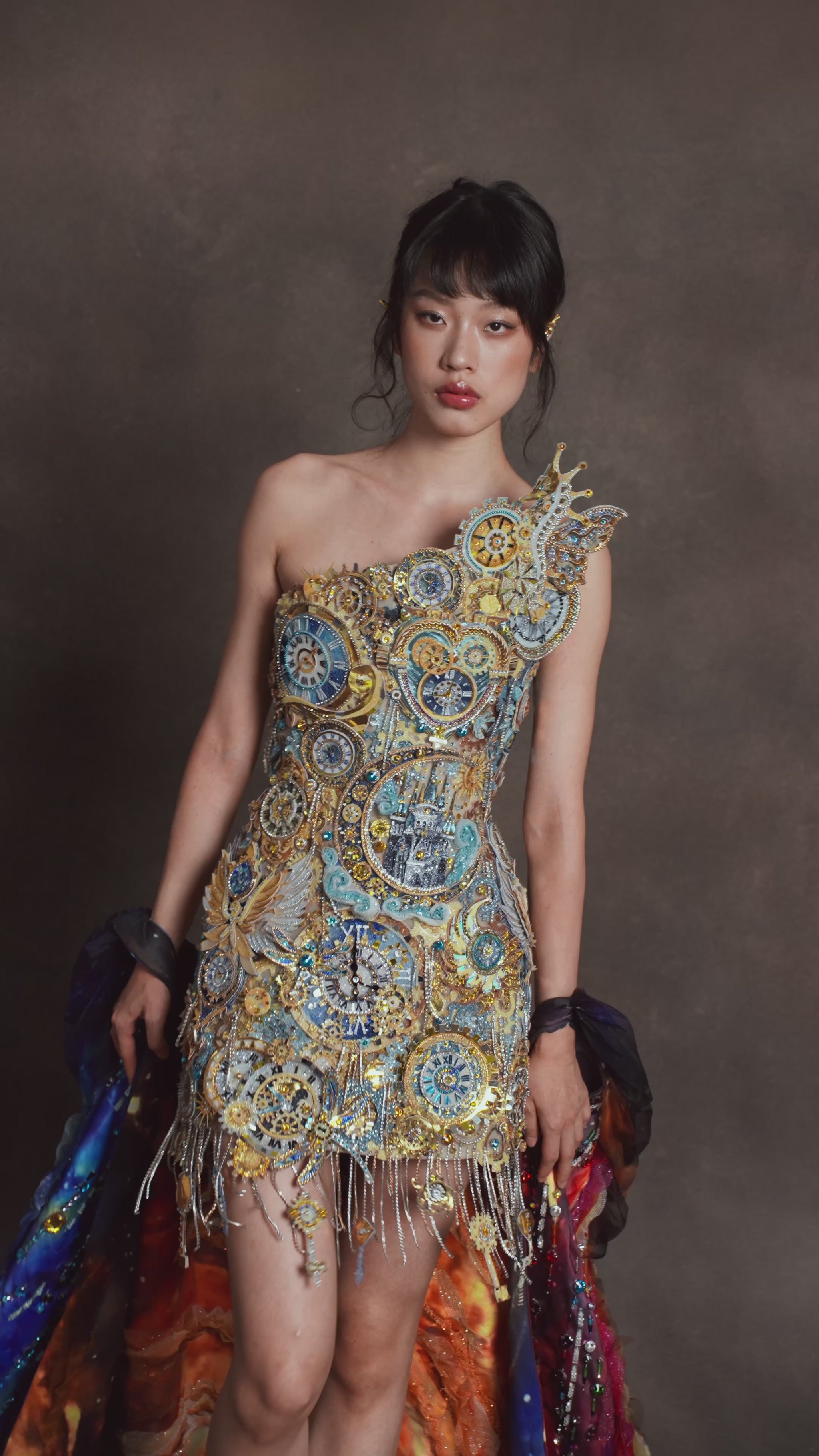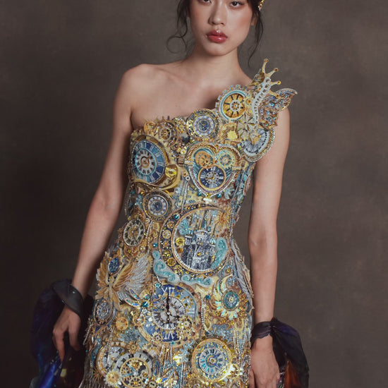 Step into the cosmos with Eternal Time, a breathtaking mini gown encrusted with golden clockworks and celestial crystals.