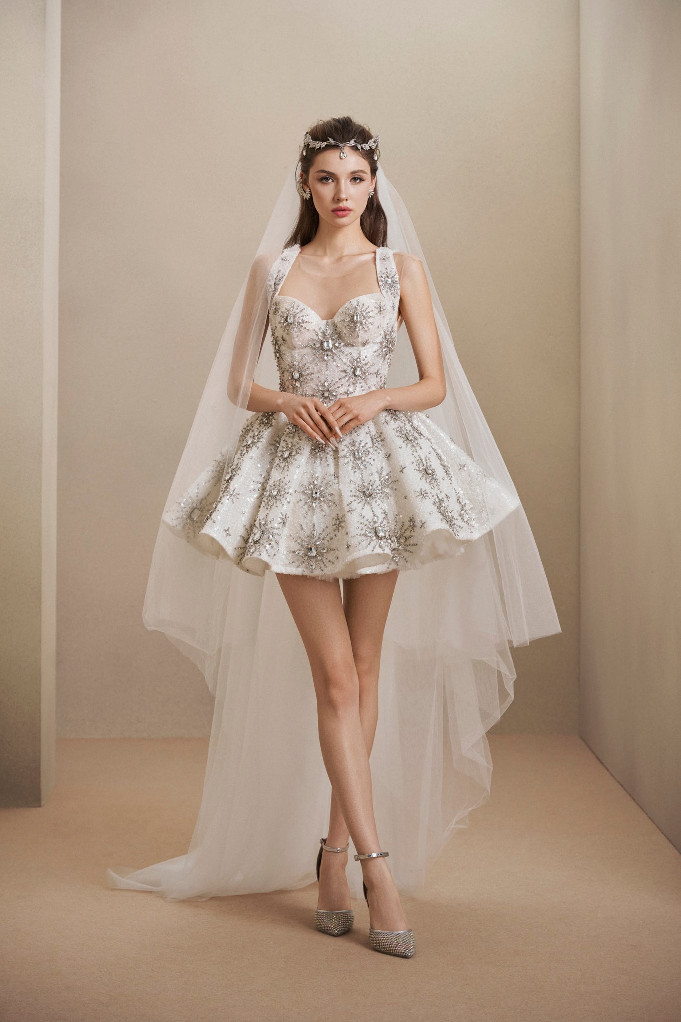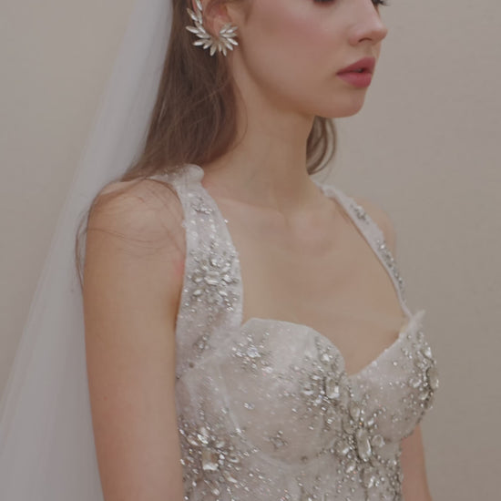 A radiant symbol of devotion — Eternal Vows sparkles with crystal starbursts embroidered across a pristine ivory canvas. The structured mini silhouette with a flowing veil brings together modern elegance and timeless bridal romance, perfect for a celestial-inspired vow.