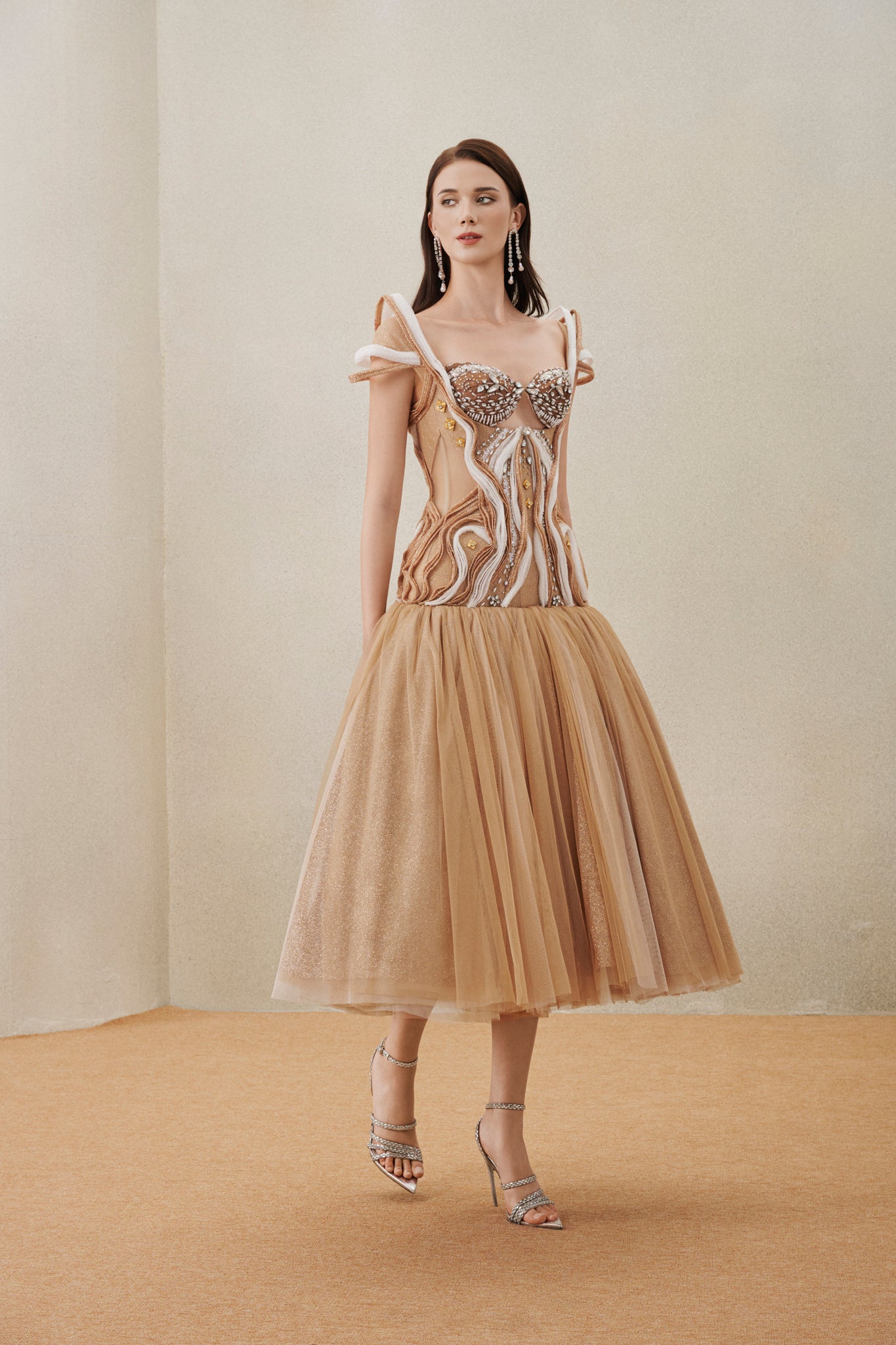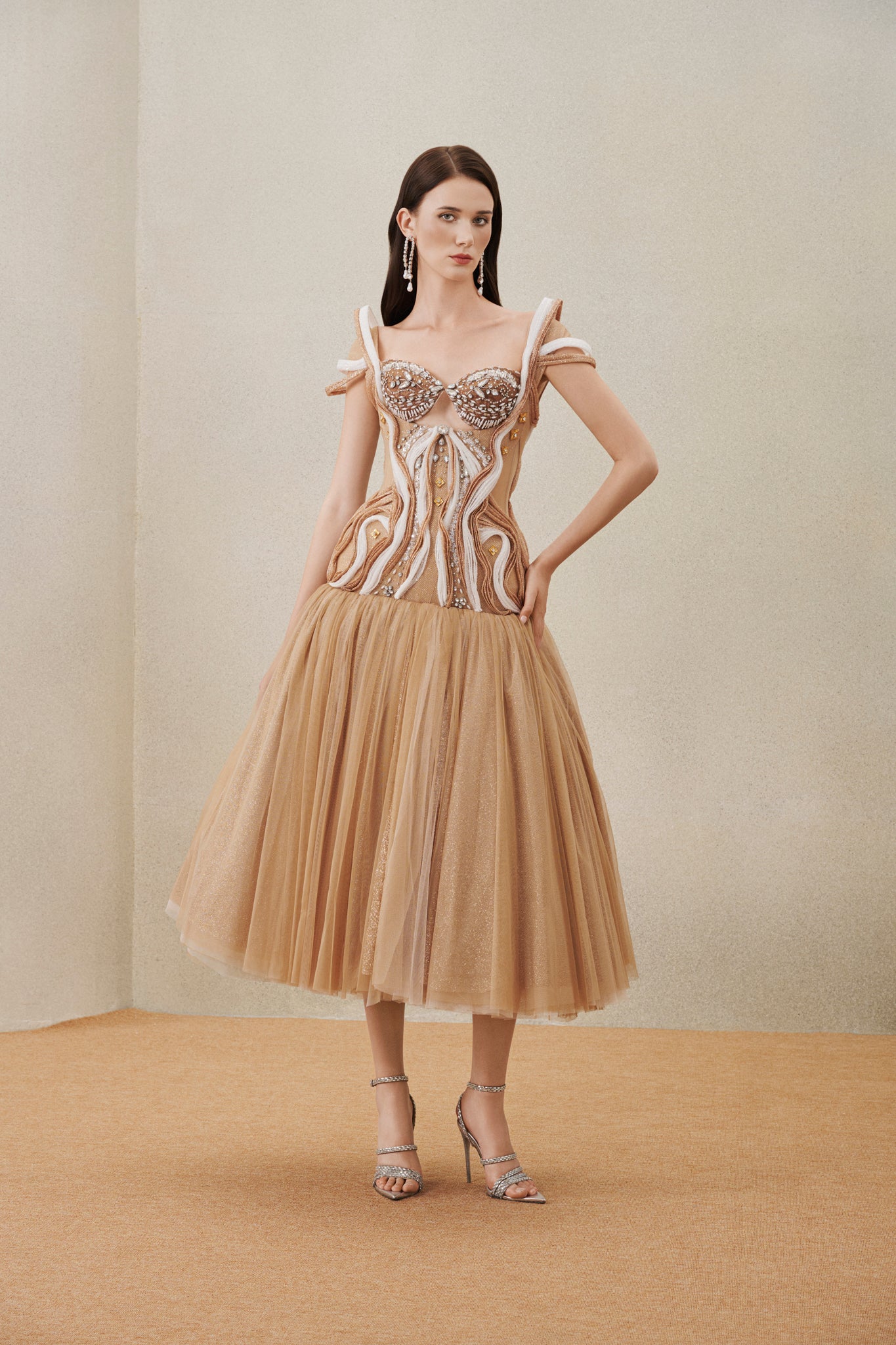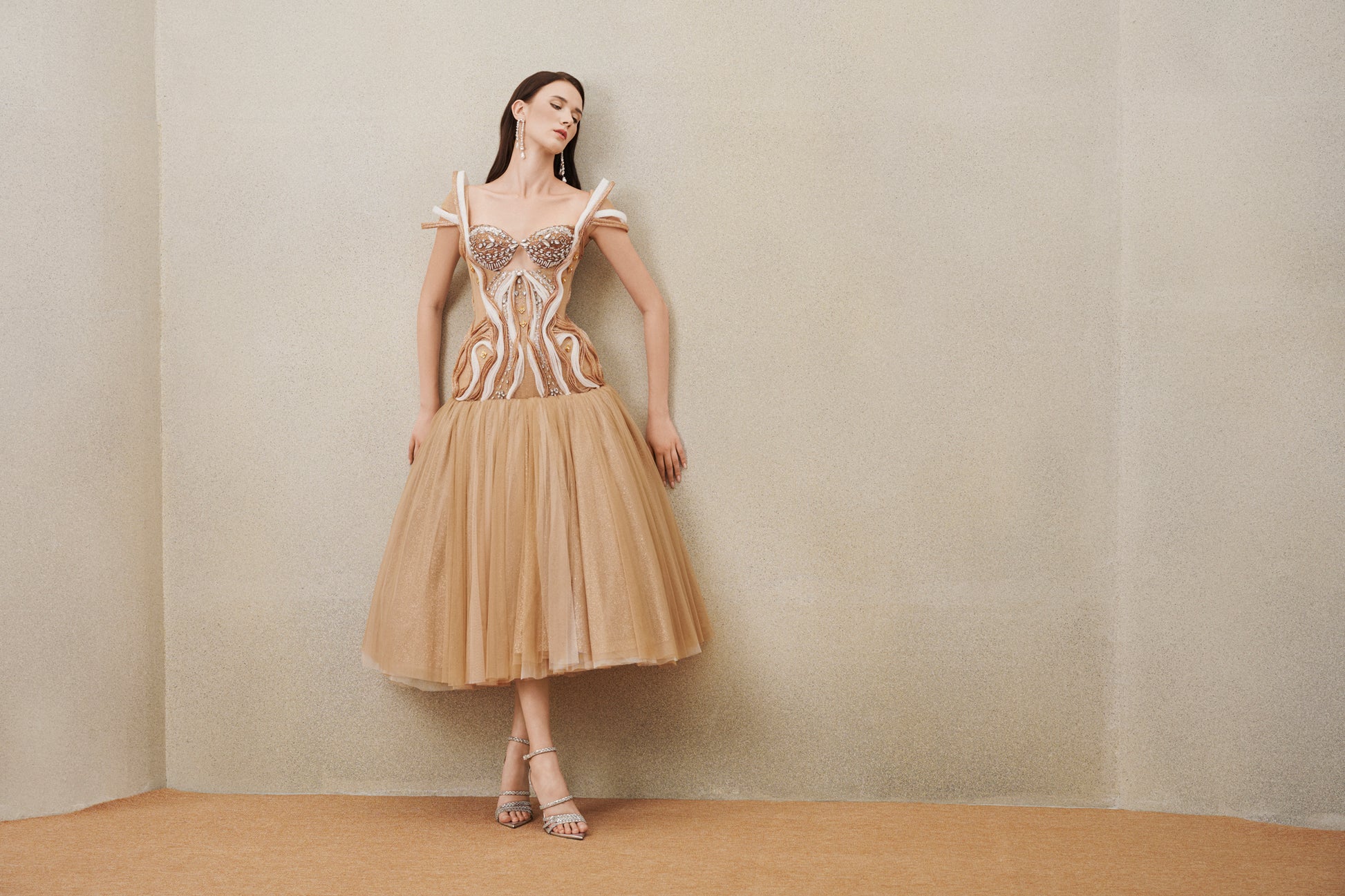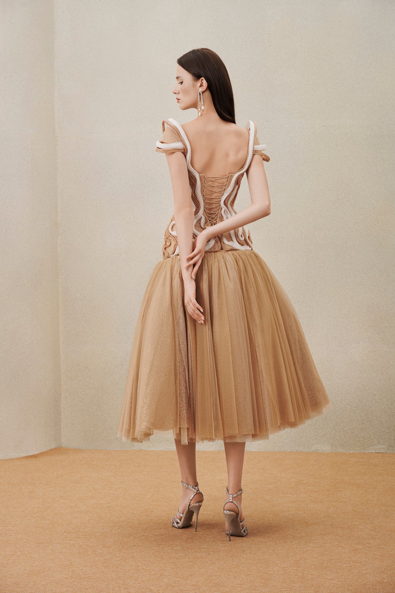 The voluminous tea-length skirt, crafted from soft shimmering tulle, creates a gentle, airy silhouette that contrasts beautifully with the architectural bodice. Elegant, modern, and artfully dimensional, this gown celebrates the artistry of hand-sculpted couture in a golden, radiant form.