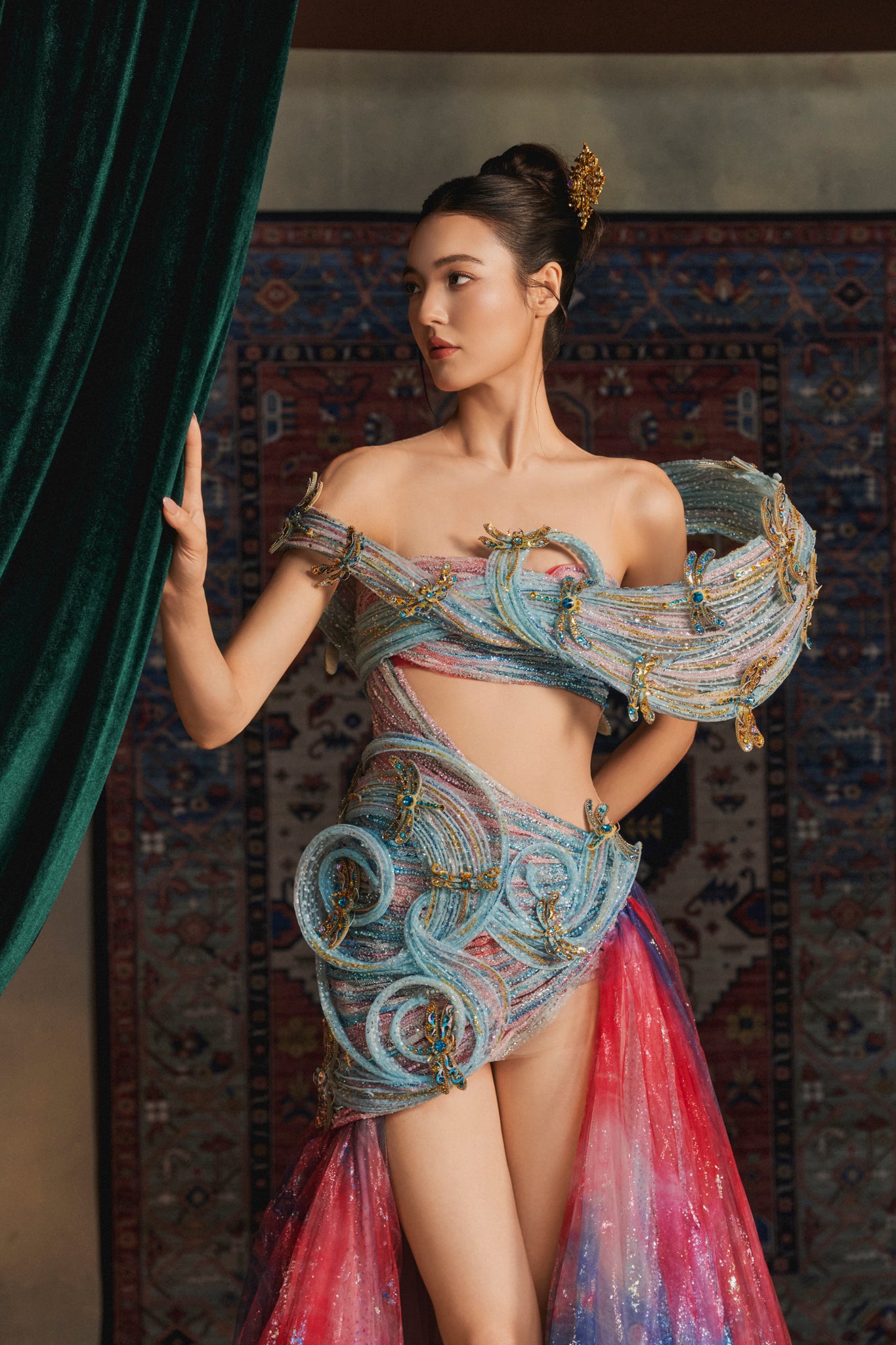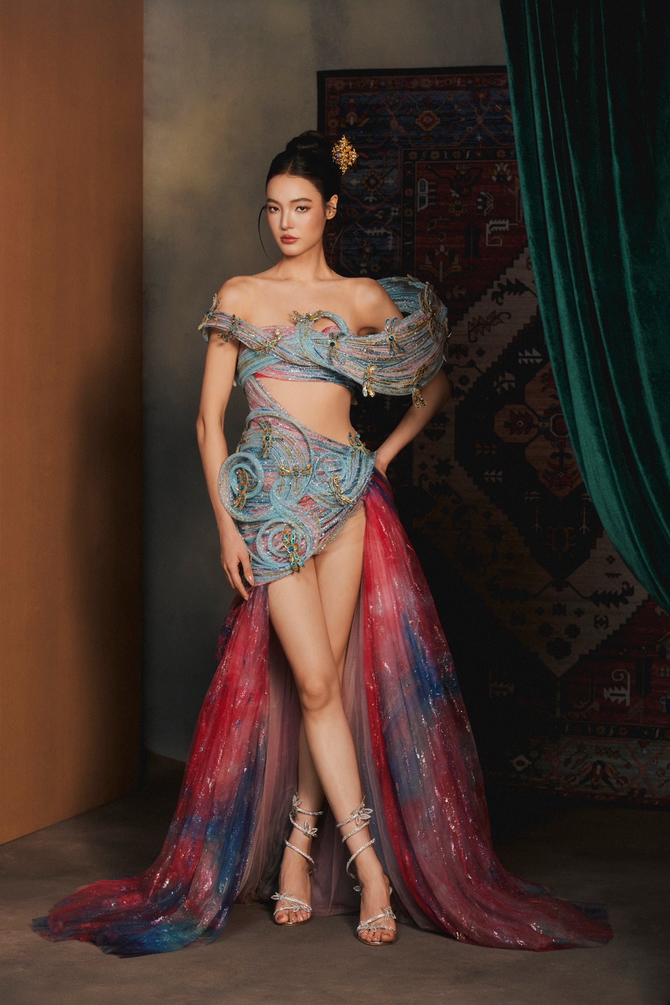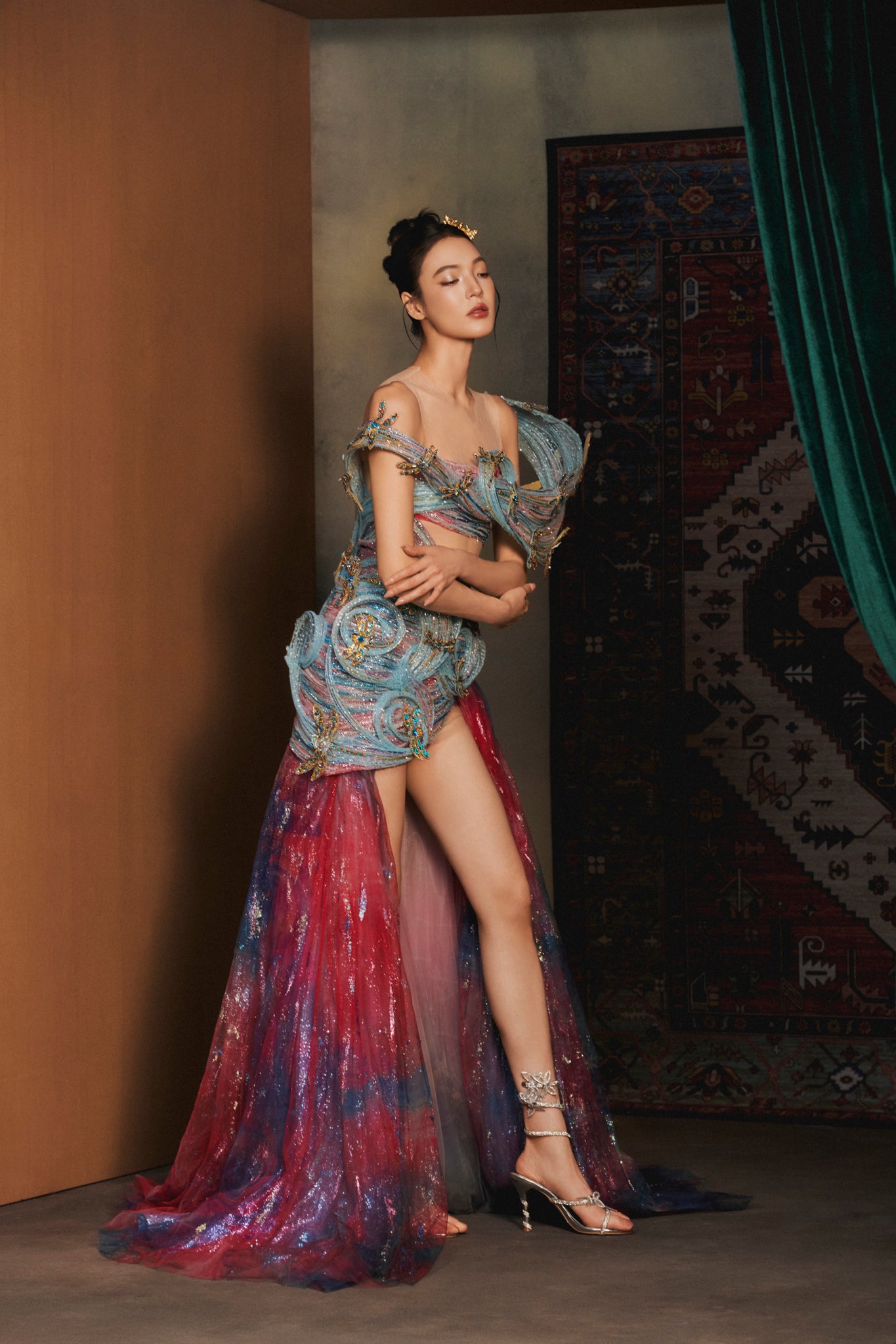 Materials: ombré tulle, metallic threads, sequins, crystal beads, gold appliqués