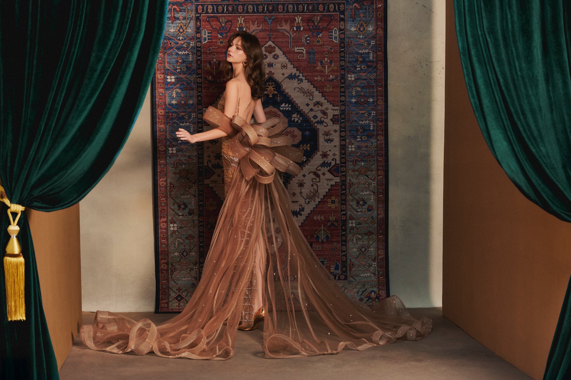 Inspired by the last light of day, Golden Sunset captures the serene glow of dusk melting into the horizon. Shimmering gold and bronze beadwork ripple like sunlit waves, flowing over a translucent silhouette that contours the body with quiet radiance. Sculpted organza ribbons bloom from the waist like drifting rays, evoking the moment when daylight fades into a gentle, eternal warmth.