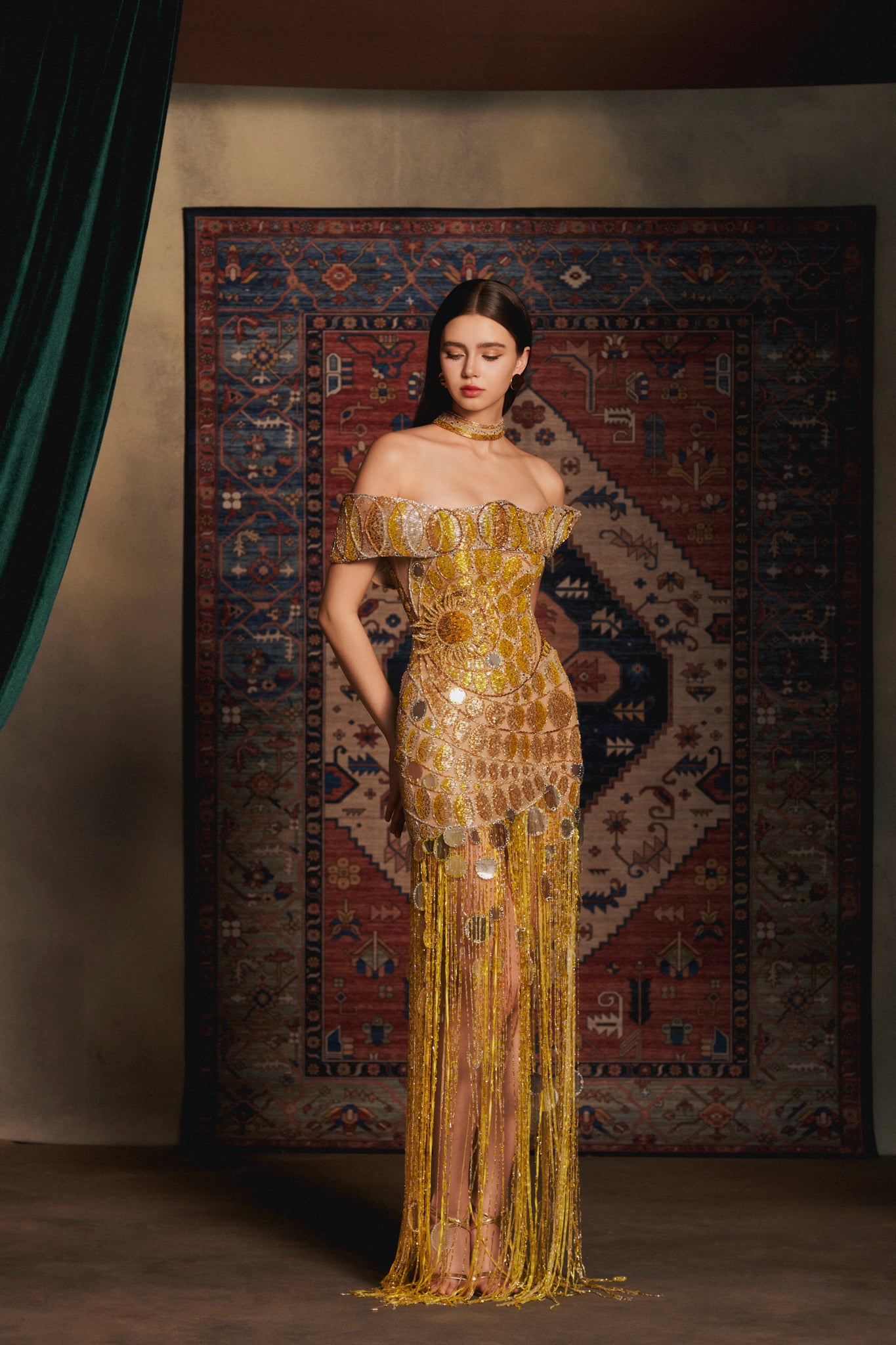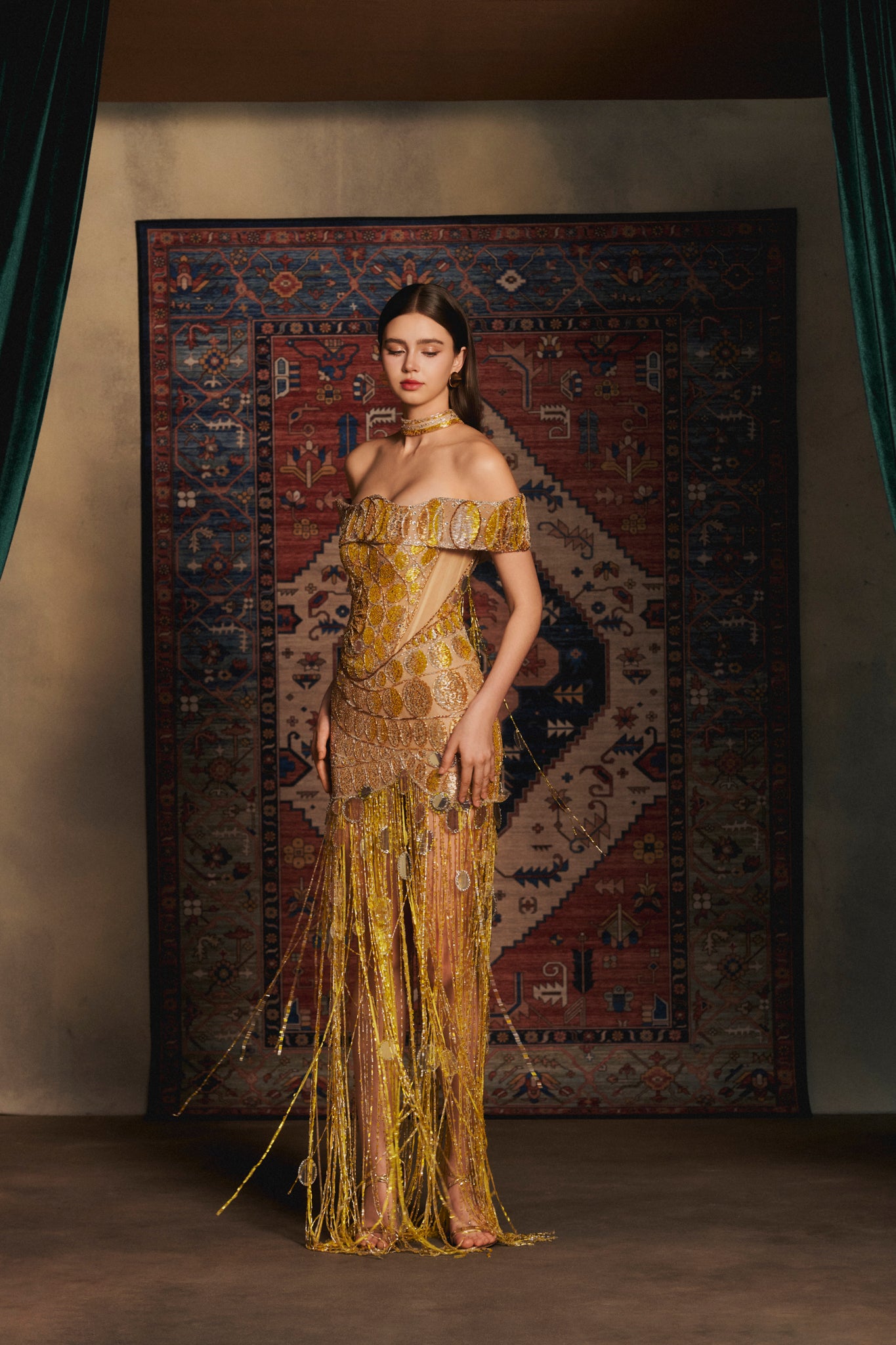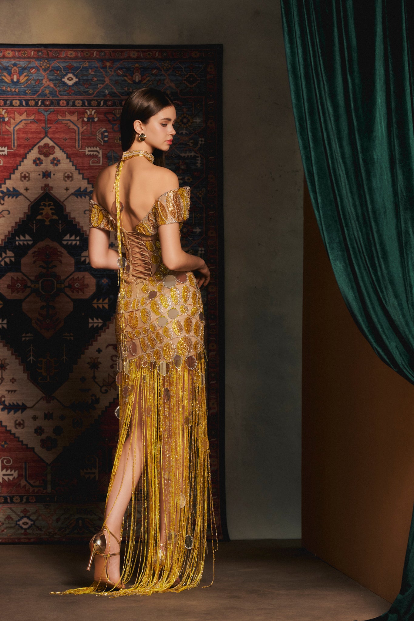 Materials: gold sequins, mirrored discs, crystal droplets, beaded tassels, nude tulle