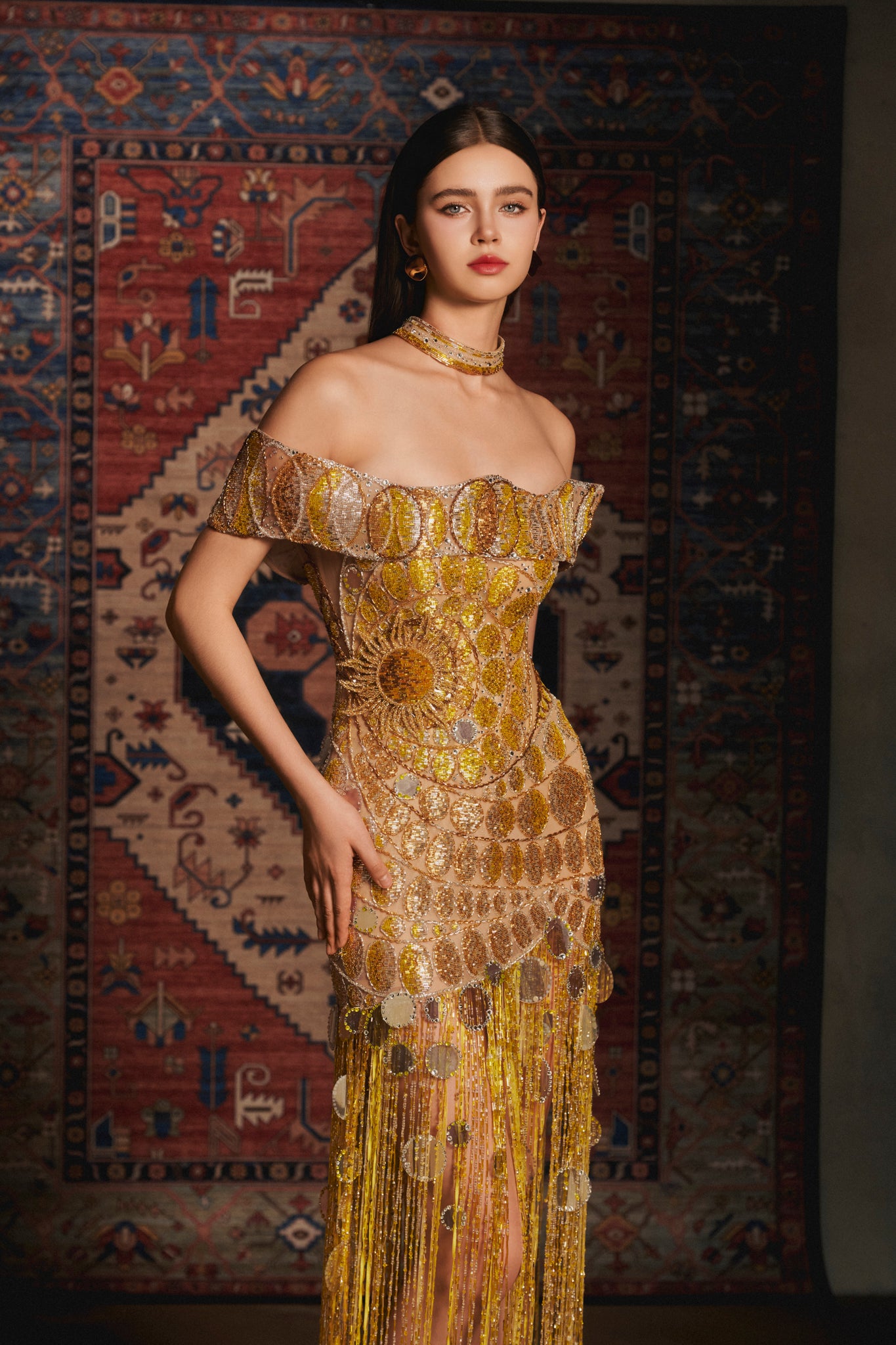 A cascade of molten sunlight, Solar Drops captures the moment dawn breaks over silent sands — each glimmering sequin echoing droplets of golden light falling from the sky. Sculpted on a nude base, the gown radiates warmth and movement through circular sun-disc motifs, shimmering strands, and celestial beading that sway with every step. A celebration of brilliance and divine femininity.