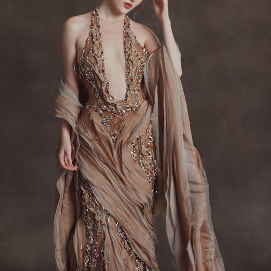 The gown’s sculpted silhouette is adorned with hand-applied golden beadwork and glistening sequins that seem to whisper under the light. Layers of sheer fabric create a soft glow, as if sunlight is filtering through ancient temple corridors.