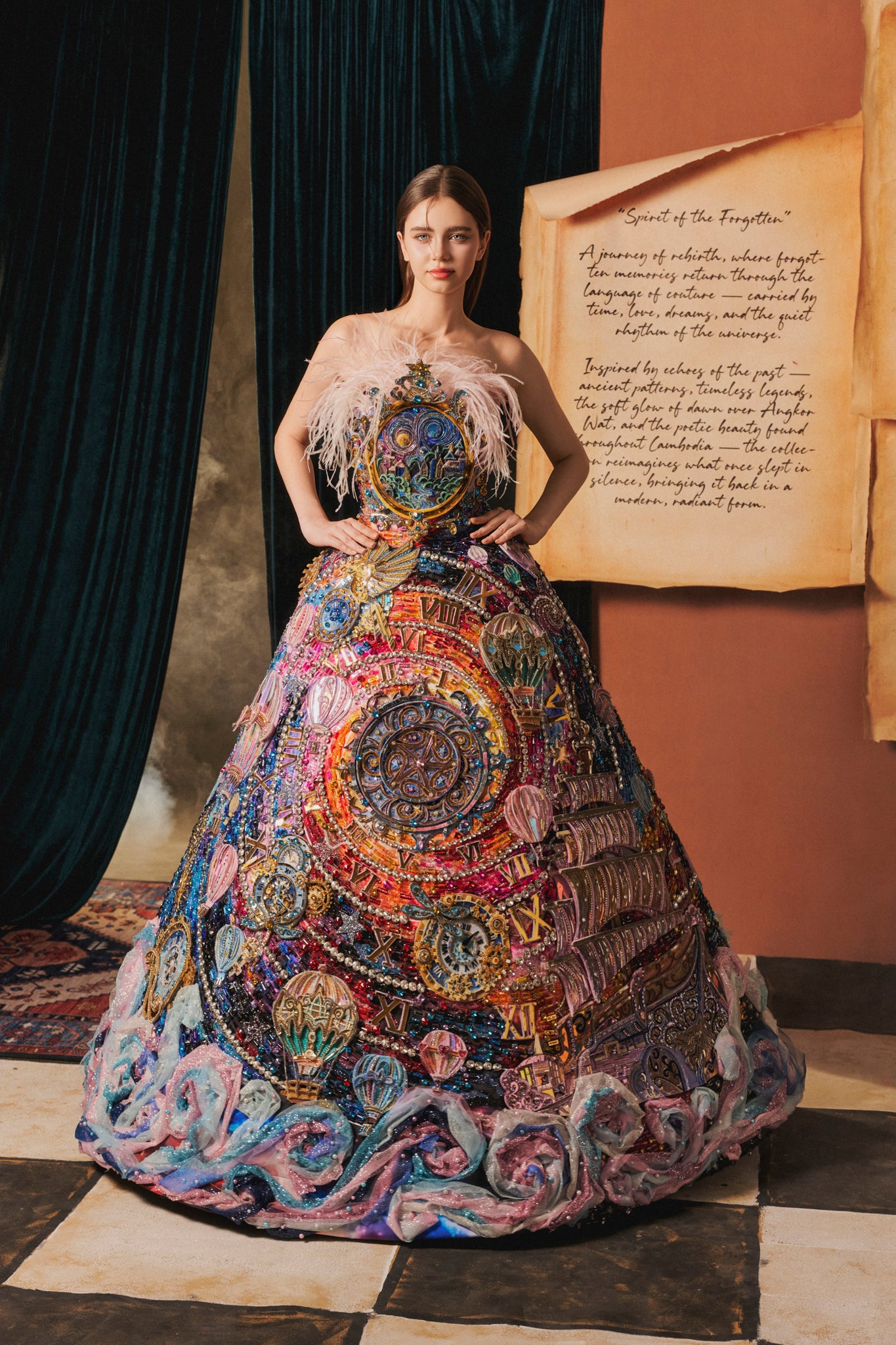 A monumental tapestry of time and memory, Time Voyage: Cosmic Odyssey captures the grandeur of celestial exploration through sculptural artistry and radiant color. Layers of hand-embellished clocks, cosmic spheres, ancient symbols, and dreamlike voyages spiral across the gown, forming a universe alive with movement. Pastel waves encircle the hem, echoing the eternal rhythm between time, destiny, and the boundless imagination of the human spirit.