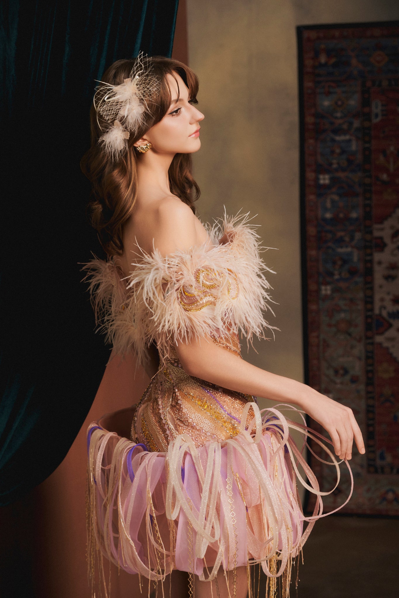 Materials: feathers, gradient organza, metallic threads, sequins, crystal appliqués