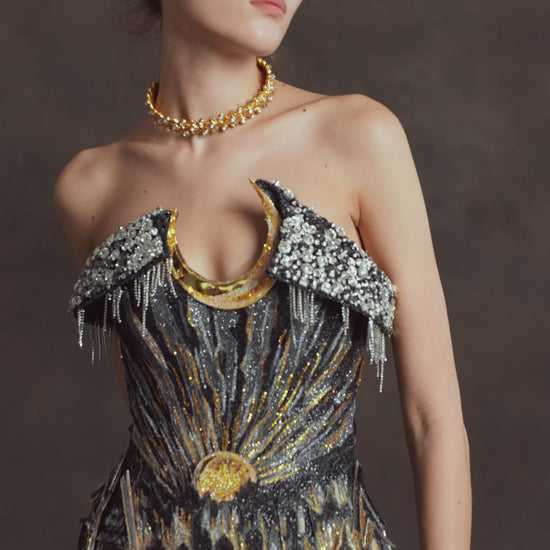 The fitted silhouette is sculpted with shimmering metallic panels, hand-embroidered constellations, and cascading golden beads that mirror the glow of a disappearing sun. The bold cutouts and sweeping train add a celestial edge, transforming the wearer into a living phenomenon.