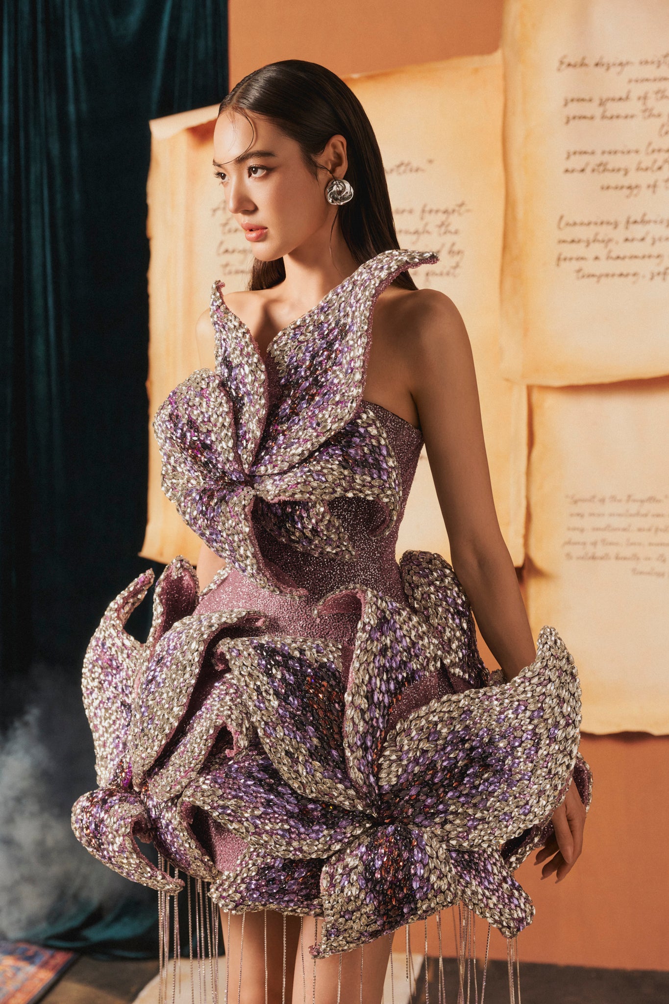 The sculptural curves evoke a lily suspended in time, its radiance preserved in crystal fragments. Draping crystal strands fall like meteor showers, adding movement with every step — a tribute to memories that glitter even as they fade into the cosmos.
