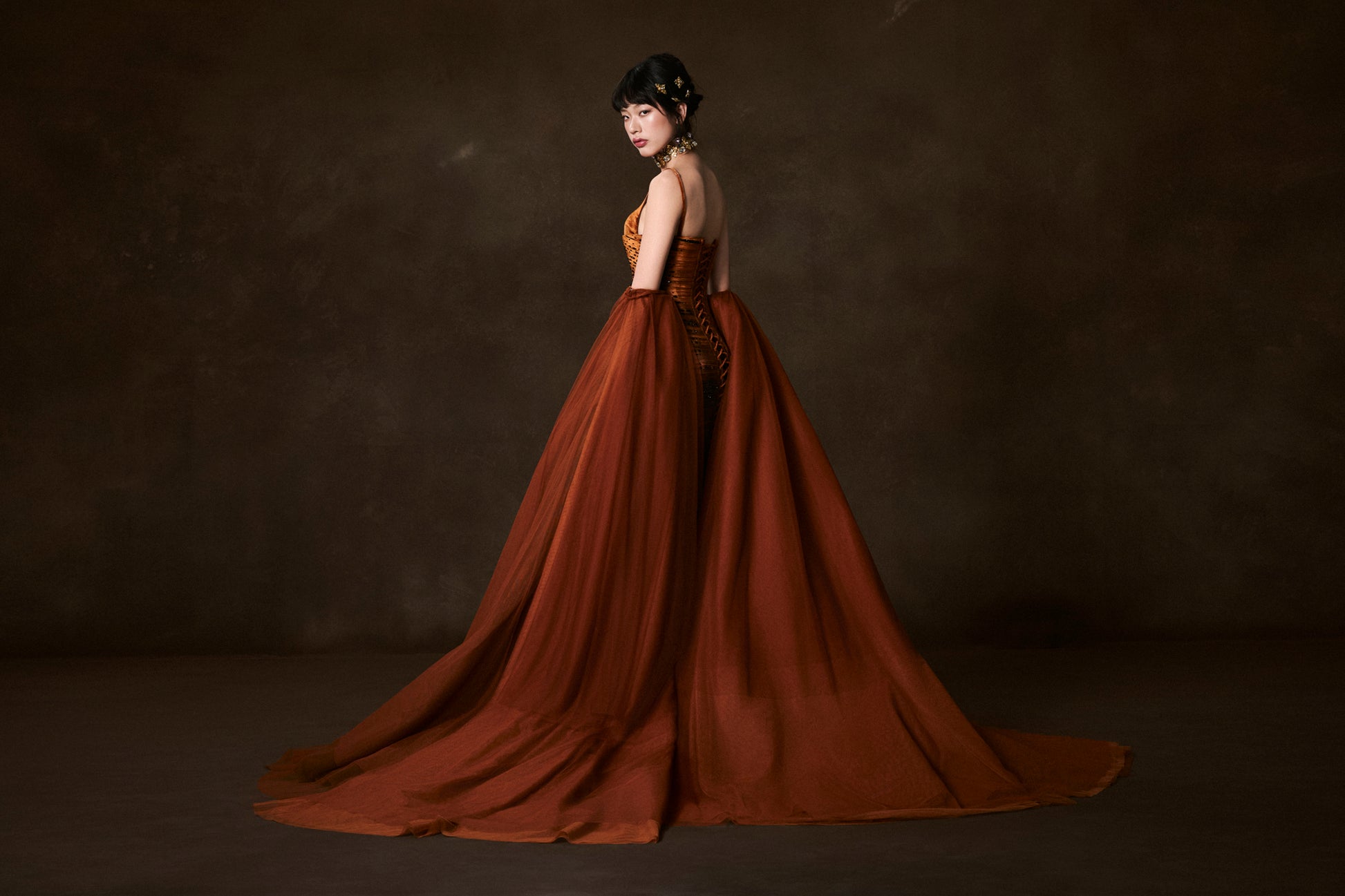 A vision of burning devotion, this gown radiates with the fiery hues of amber and copper, symbolizing a solemn vow written in the stars. Draped in velvet and layered tulle, the silhouette glows like molten dusk, while streams of black crystals spiral across the bodice, evoking constellations bound together in eternal promise. The flowing cape adds both grandeur and mystique, embodying the timeless strength of an unbreakable oath.