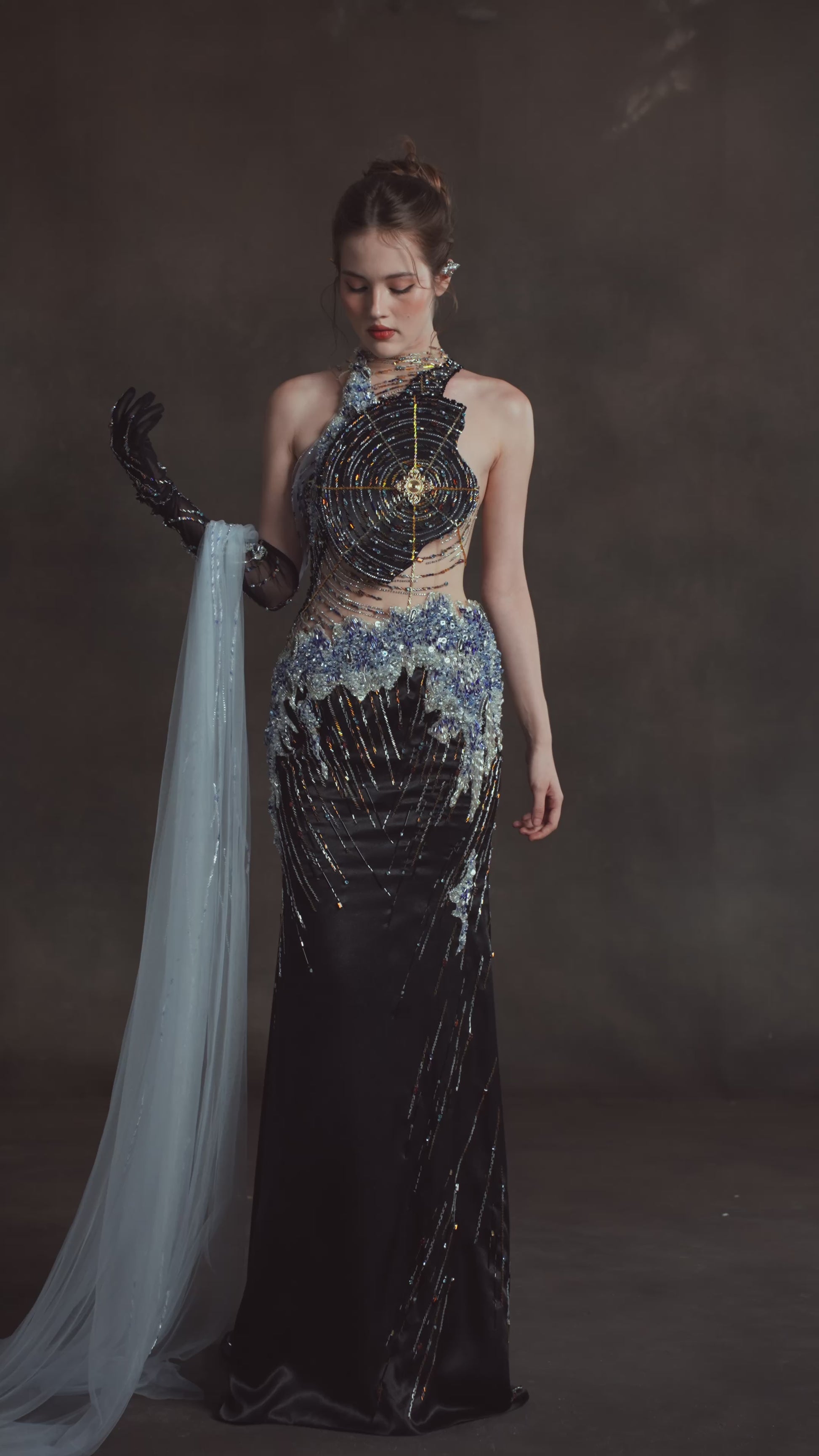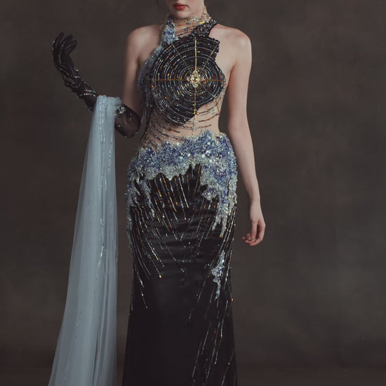 Circular beadwork and metallic embroidery trace orbital patterns across the bodice, while the voluminous skirt glimmers like a galaxy in motion. Each step sends constellations into a slow dance, evoking the eternal cycles of creation and rebirth.