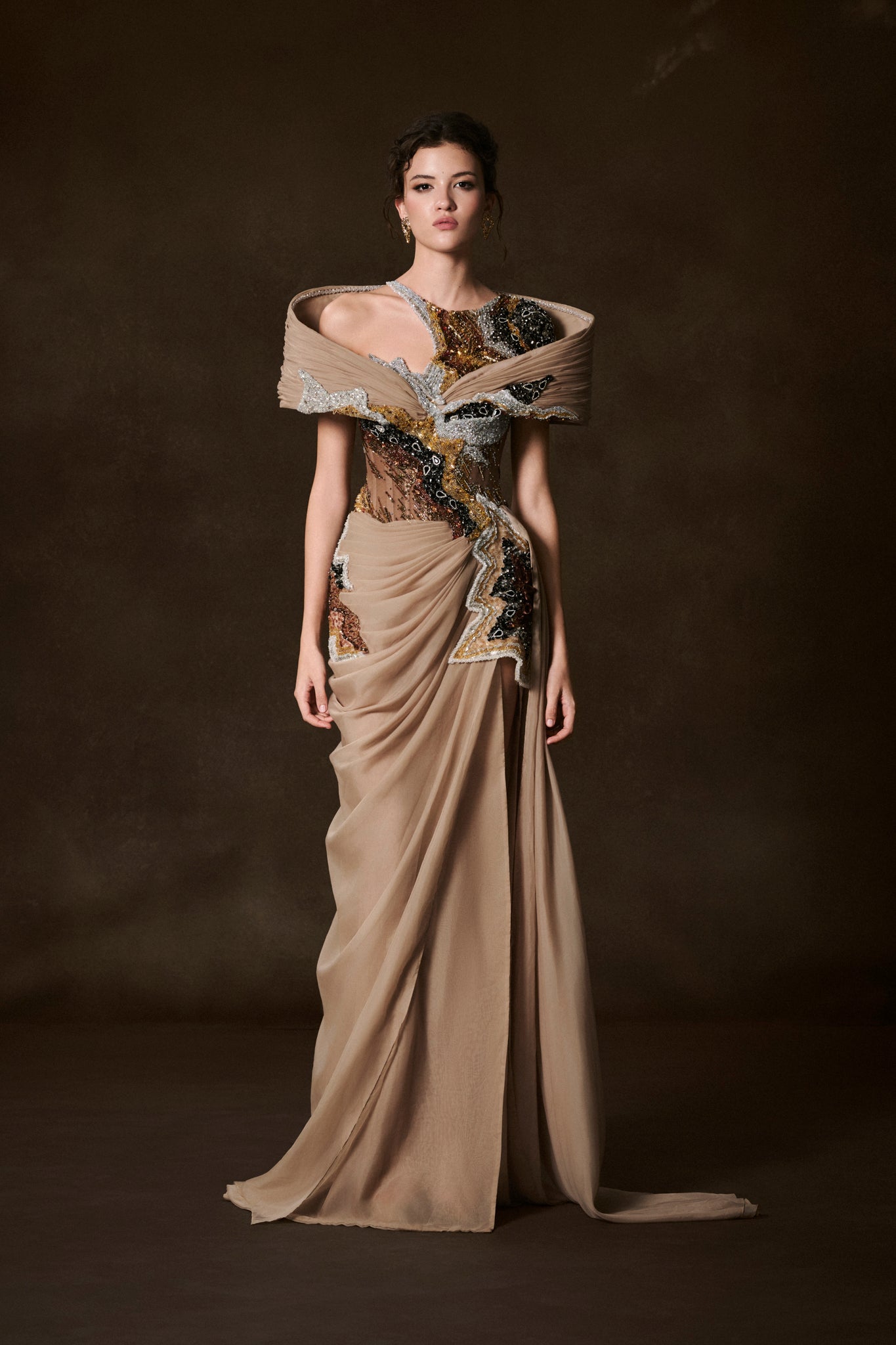 An evocative gown that mirrors the delicate fractures of time, where every shard of memory is captured in shimmering embroidery. The structured neckline unfolds like ancient relics rediscovered, while flowing drapes of silk evoke the soft erosion of moments fading into history. Each detail embodies both strength and fragility, weaving together the poetry of what endures and what slips away.