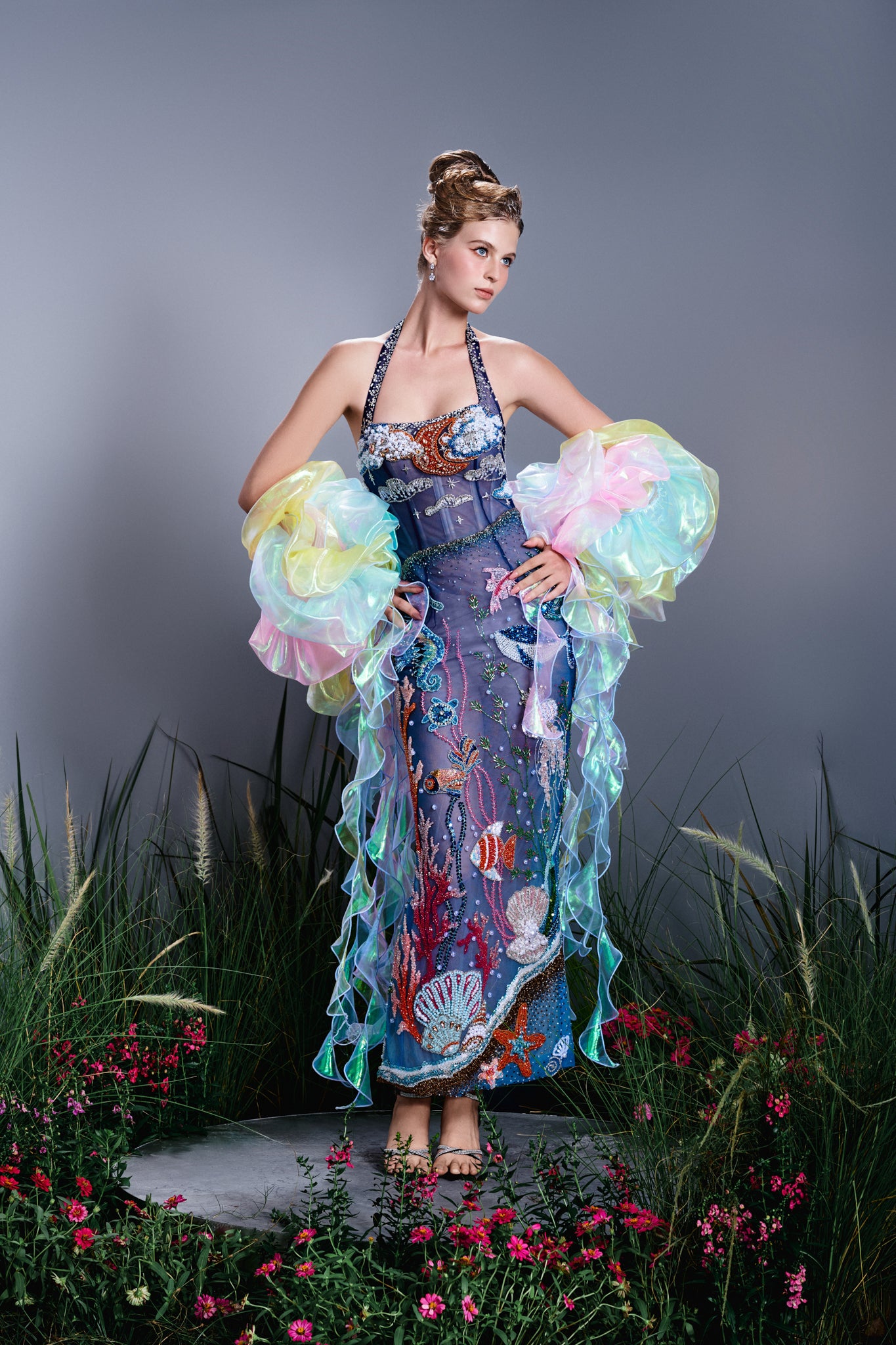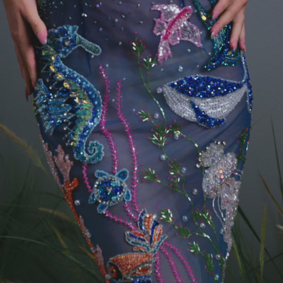 An enchanting seascape brought to life in couture form, this gown evokes the mysteries of the deep ocean. Hand-embroidered corals, seashells, and sea creatures shimmer against a translucent base, crowned with a celestial moon and drifting clouds across the bodice. A poetic blend of sea and sky, it celebrates the eternal rhythm of nature’s sonata.