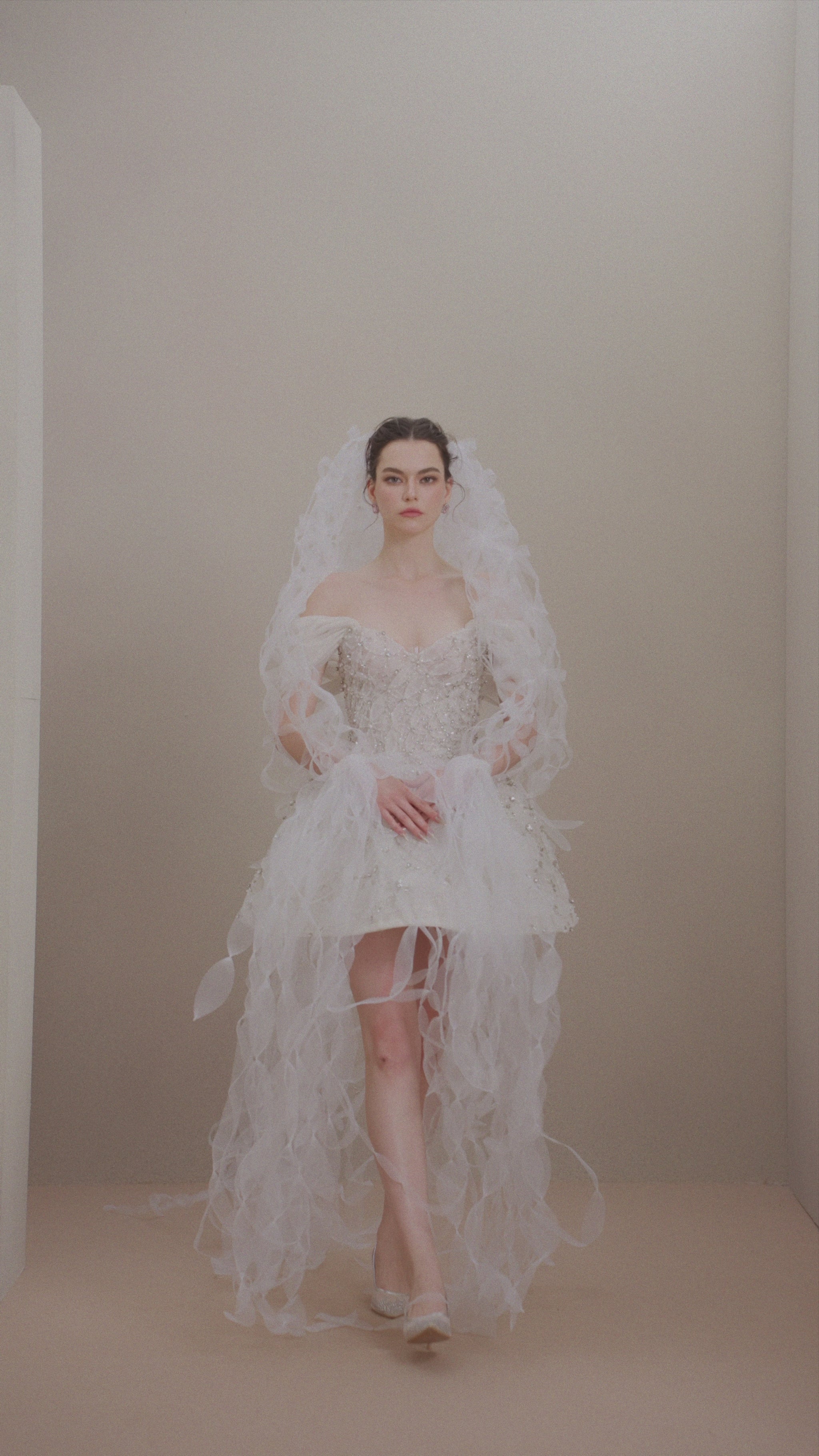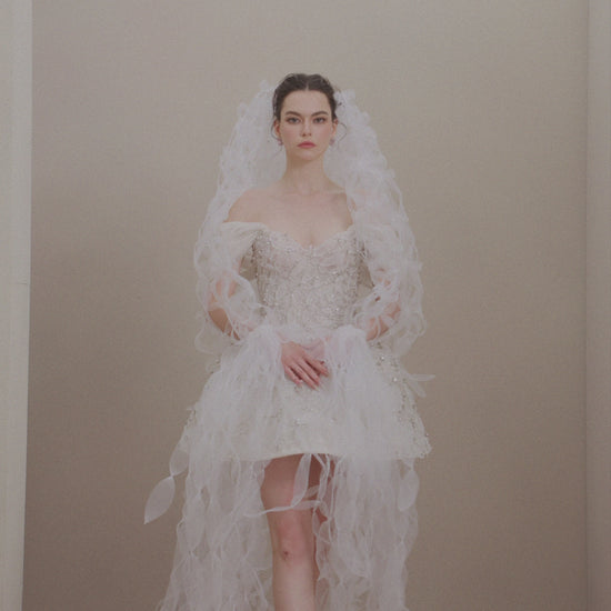 Romantic and ethereal — Moonlit Blossom blooms under the silver glow of the moon. Adorned with delicate crystal embroidery in petal-like patterns, this mini dress is paired with cascading tulle veils, evoking the image of moonlit flowers drifting in the night air.