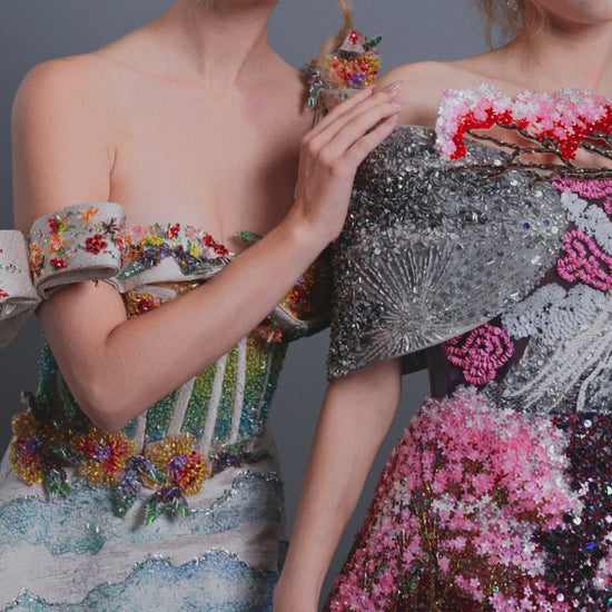 Materials: silk tulle, organza, crystals, gemstones, sequins