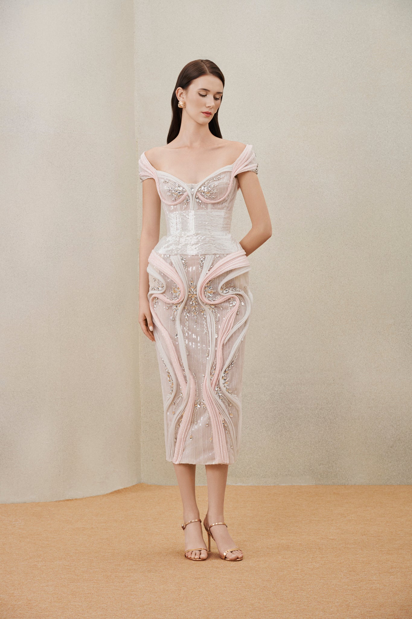 The off-shoulder neckline frames the collarbone with effortless elegance, while the fitted corset and elongated skirt create a statuesque, feminine line. Light, graceful, and poetic, this design captures ALmée’s signature harmony between structure and softness.