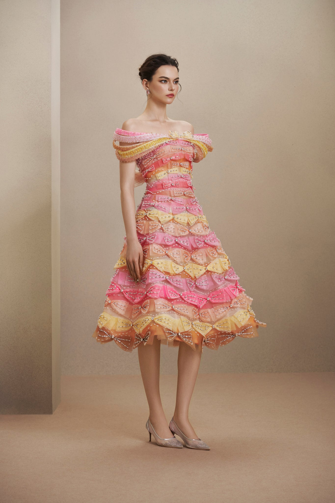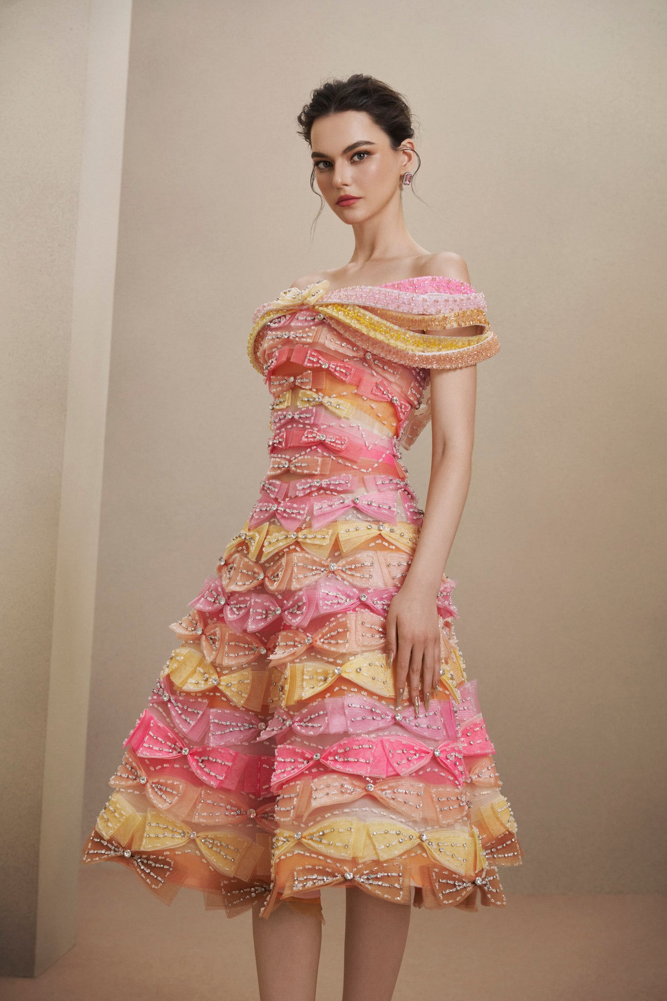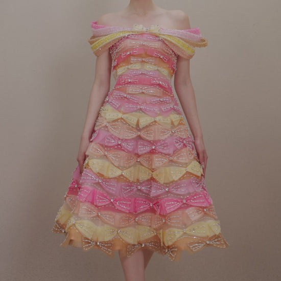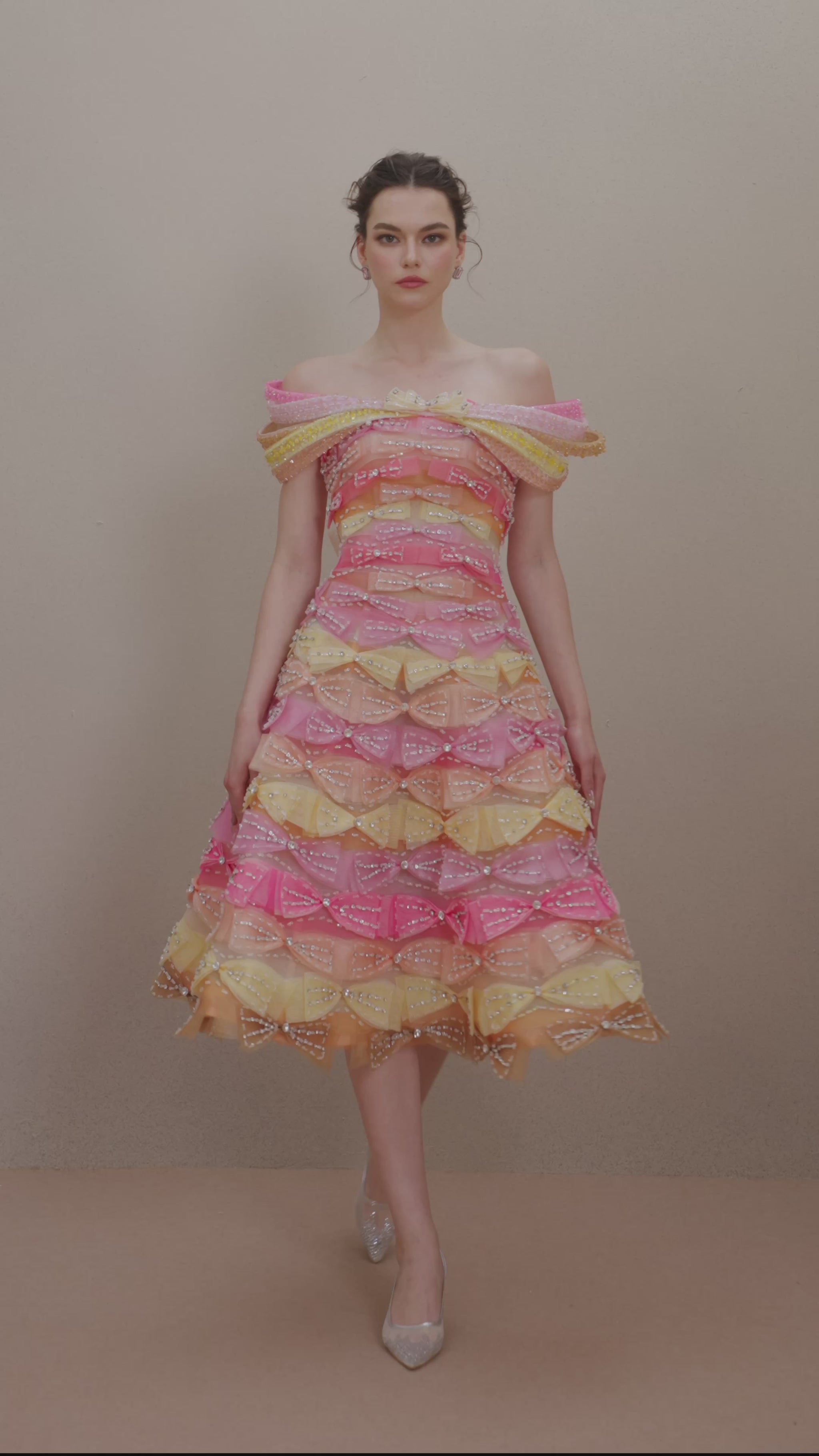 Joyful and radiant — Sunlit Ribbons dazzles with layers of pastel bows in sunset shades of gold, coral, and pink, each adorned with delicate crystals. The off-shoulder neckline and flared skirt create a playful yet elegant silhouette that shines with youthful charm.